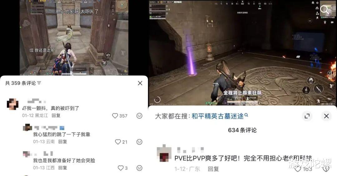 古墓迷途无论是PVE还是PVP,玩家体验过程中都会有一部分心理压力源,从短暂且猛烈的PVP博弈,转向整体环境和氛围,并且这种压力与刺激感更有持续性和循序渐进。