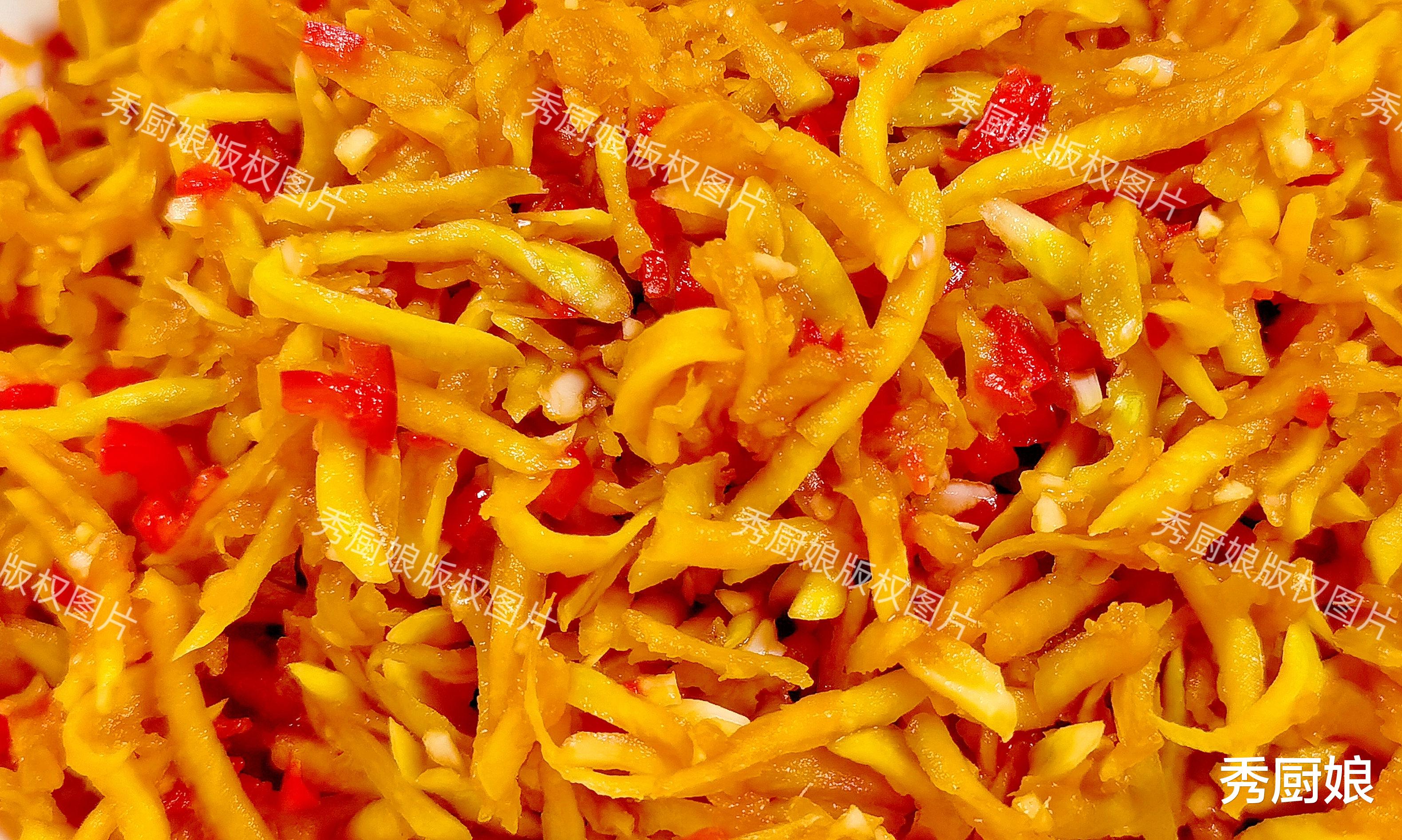 腌南瓜丝酸辣爽口,香味浓郁,非常适合作为下饭小菜。南瓜的天然甜味在腌制过程中被辣味和蒜香激发出来,让人忍不住一口接一口,是冬日餐桌上一道开胃的亮点。