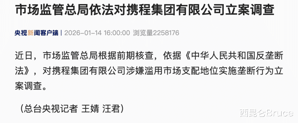 国家市场监管总局1月14日发布通报,根据前期核查,依据《反垄断法》,对携程集团有限公司涉嫌滥用市场支配地位实施垄断行为立案调查。