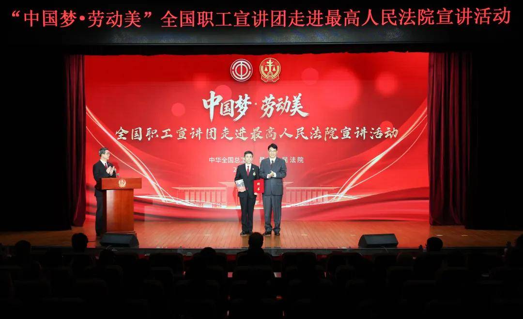 宣讲活动上,中华全国总工会副主席候选人、书记处书记人选、党组成员郑玄波为全国先进工作者、北京金融法院丁宇翔法官颁授“中国梦·劳动美”全国职工宣讲团宣讲员聘书,并赠送书籍《习近平与一线职工朋友们》。