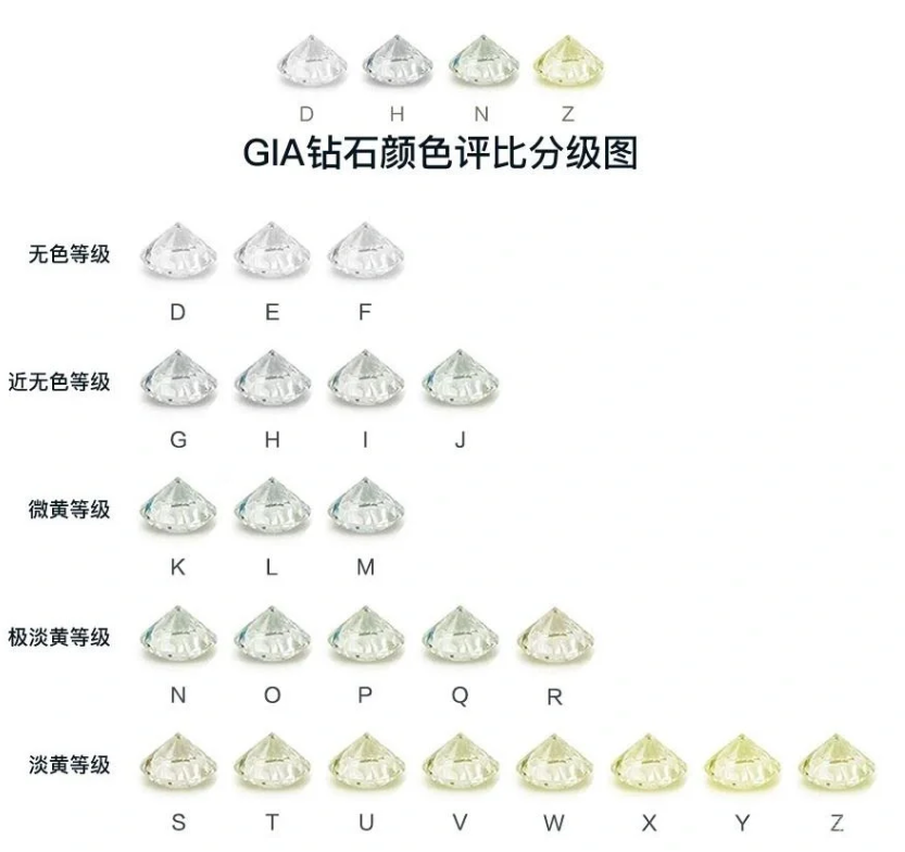 不同国家和地区对钻石颜色级别的表示方法各不相同,目前主流的颜色分级体系主要有 GIA 体系、欧洲体系和中国体系三类。无论采用哪种体系,钻石的颜色越白,价值便越高,颜色级别每提升一个档次,其价格便会呈几何倍数增长。