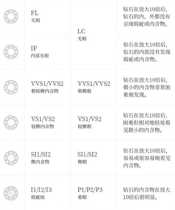 钻石净度分级,是在十倍放大镜下,对钻石的内部内含物和外部表面特征进行细致划分。天然钻石皆有天然生长痕迹,世上并无绝对完美无瑕的钻石,净度越高的钻石,价值也就越高。我国国标(GB/T 16554-2017)将钻石净度划分为 LC、VVS、VS、SI、P 五个大级别,又细分为 FL、IF、VVS1、VVS2、VS1、VS2、SI1、SI2、P1、P2、P3 共 11 个细分级别。