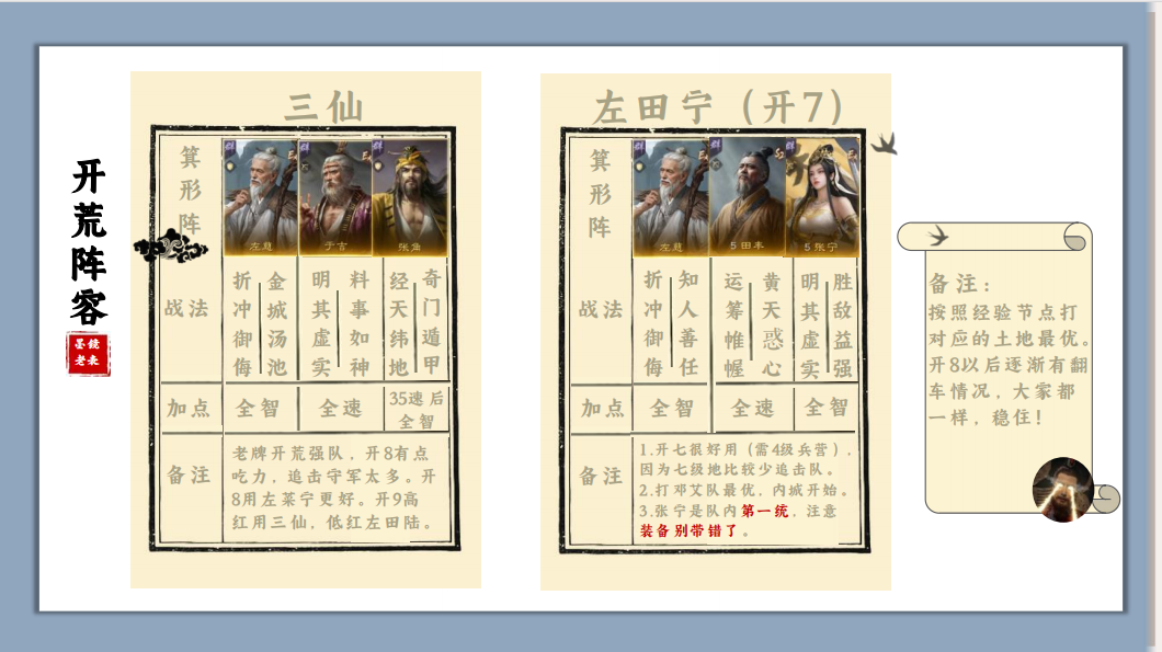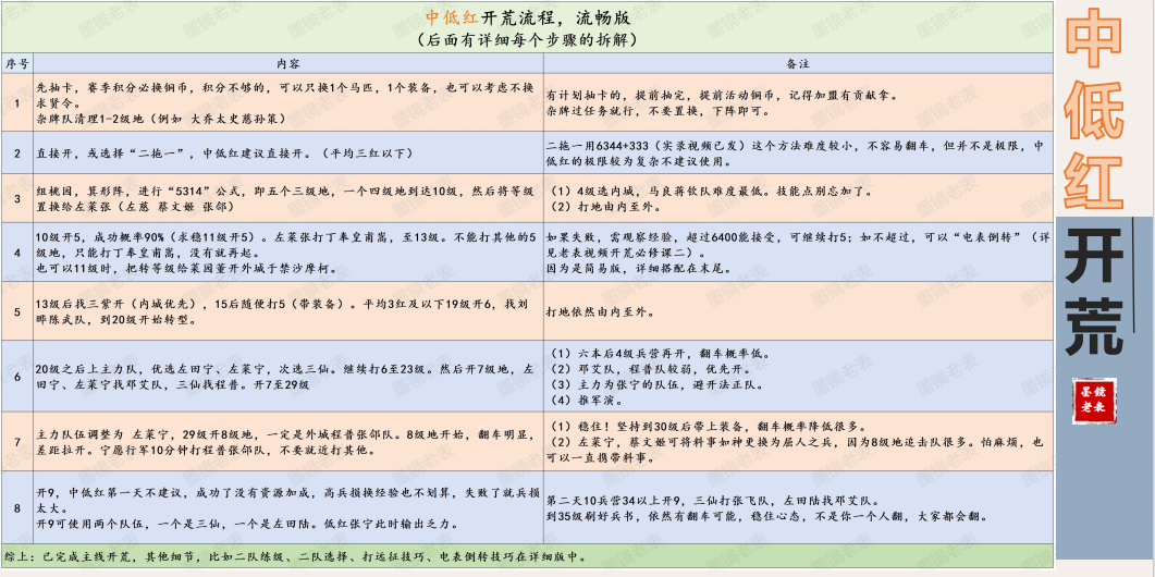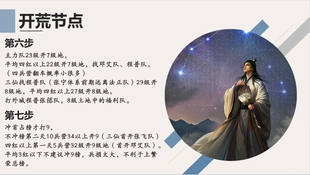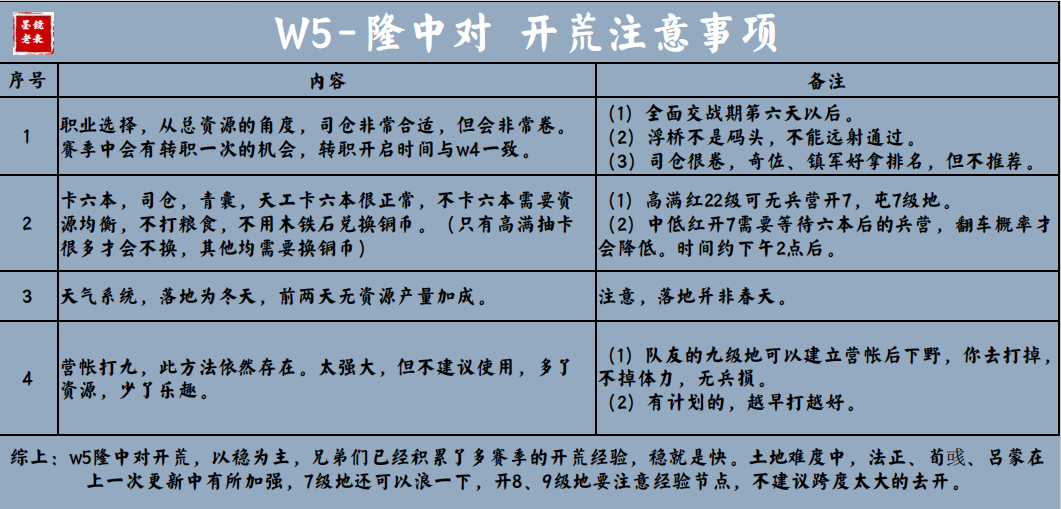 本赛季有天气系统,落地为冬天,前两天无资源产量加成。总的来说,w5隆中对开荒,以稳为主,兄弟们已经积累了多个赛季的开荒经验,稳就是快。土地难度中,法正、荀彧、吕蒙在上一次更新中有所加强,7级地还可以浪一下,开8、9级地要注意经验节点,不建议跨度太大的去开。
