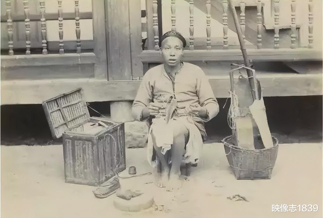 清朝街头的一个皮鞋匠,他正在专心地工作,遇到拍照的英国老奶奶,好奇地抬头望了一眼。