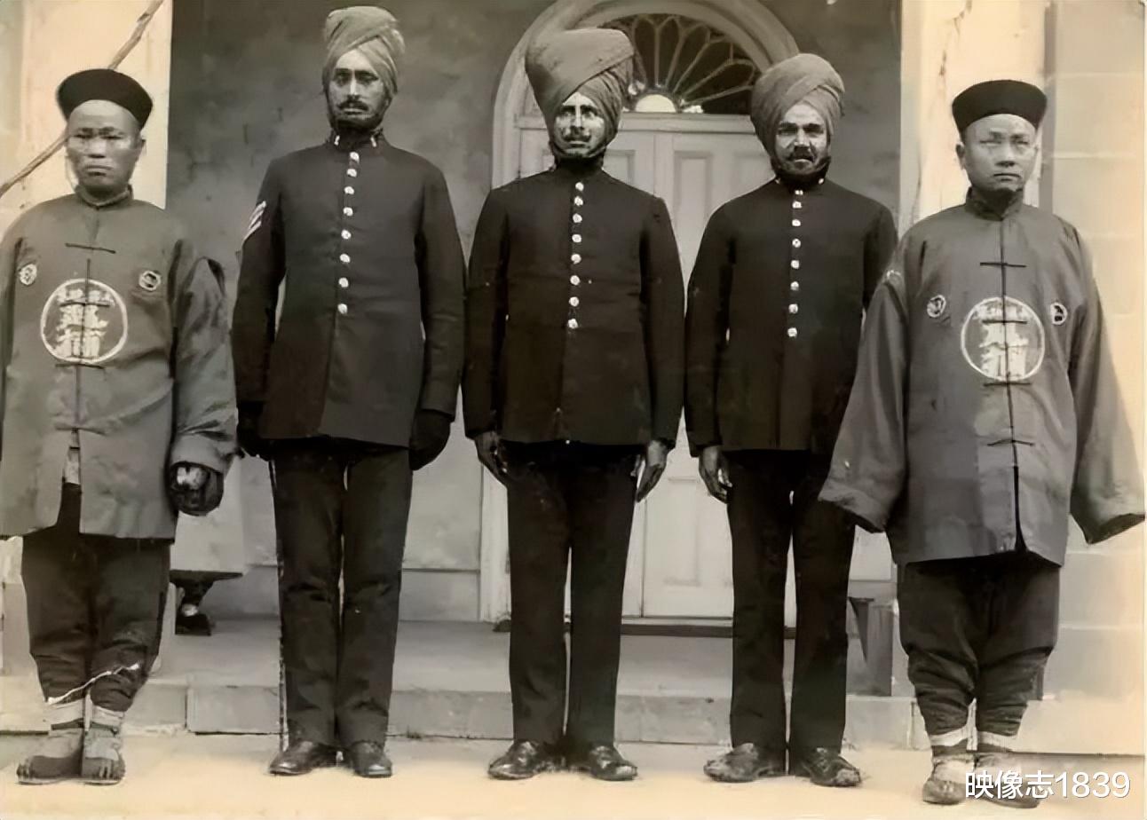 清朝时,武汉巡捕房的公职人员:中间三位是印度雇员,用上海话叫“阿三”,两旁的是清朝本土巡捕。