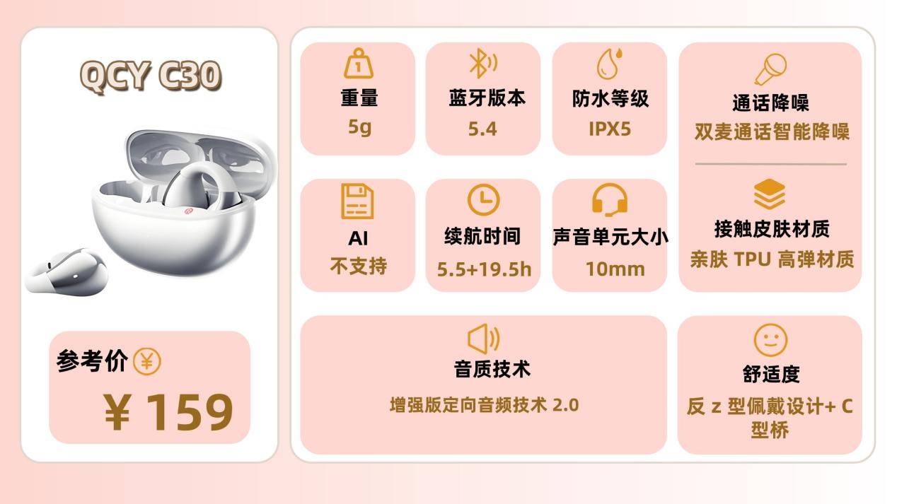 单耳才5g,反Z型耳夹设计特聪明,C桥能贴耳廓弧度,厚耳薄耳都稳,跑步甩头也不掉,戴眼镜也不硌。但耳夹偏硬,久戴两小时以上,耳廓会有点夹得慌,得偶尔摘下来松松。IPX5防水够靠谱,运动暴汗、小雨淋到都不怕,百元机这配置很良心。