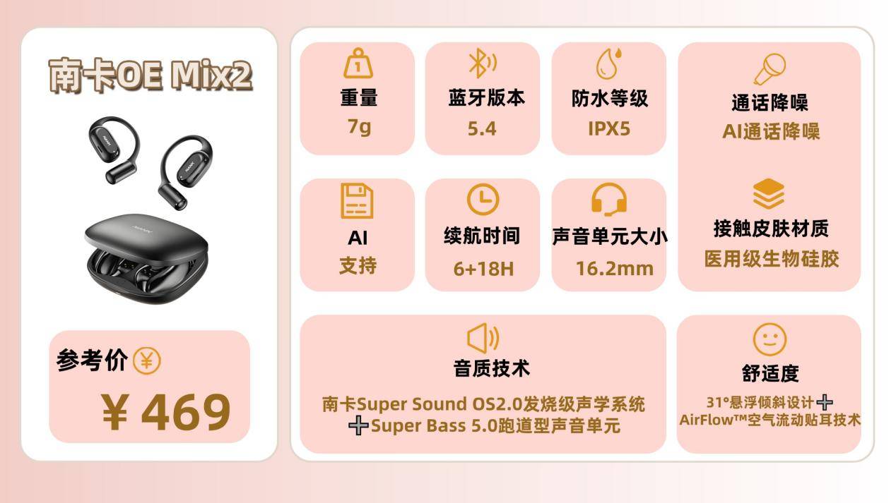 为了带来极致的使用体验,南卡OE Mix2不仅搭载了高定制蓝牙5.4芯片SOC,性能更加强劲,抗干扰性更出色,实现了秒级连接和响应。还有着更高的数据传输速度、更低的能耗、更低的通信延迟。同时还配备了6+18H的长续航,双麦克风通话降噪、IPX5防水以及AI智能等多项功能,这个配置哪怕是放在千元机型上也是非常罕见的,可谓是诚意满满,性价比非常高!