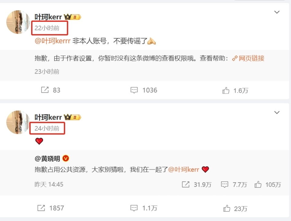 不过,叶柯对于有关他们已经结婚的不实传闻表示不解,并通过分享与黄晓明及其团队的聊天记录来澄清。甚至在回应微博后,紧跟着发布“非本人账号,不要传谣了”的微博,让粉丝和公众摸不着头脑。