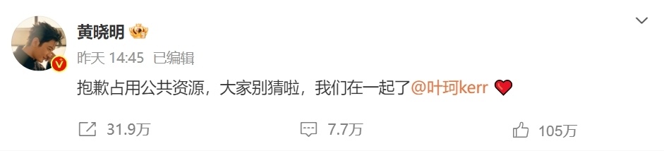 黄晓明在2024年9月19日通过微博正式宣布了与叶柯的恋情,他发文表示:“抱歉占用公共资源,大家别猜啦,我们在一起了”,并@了叶柯。