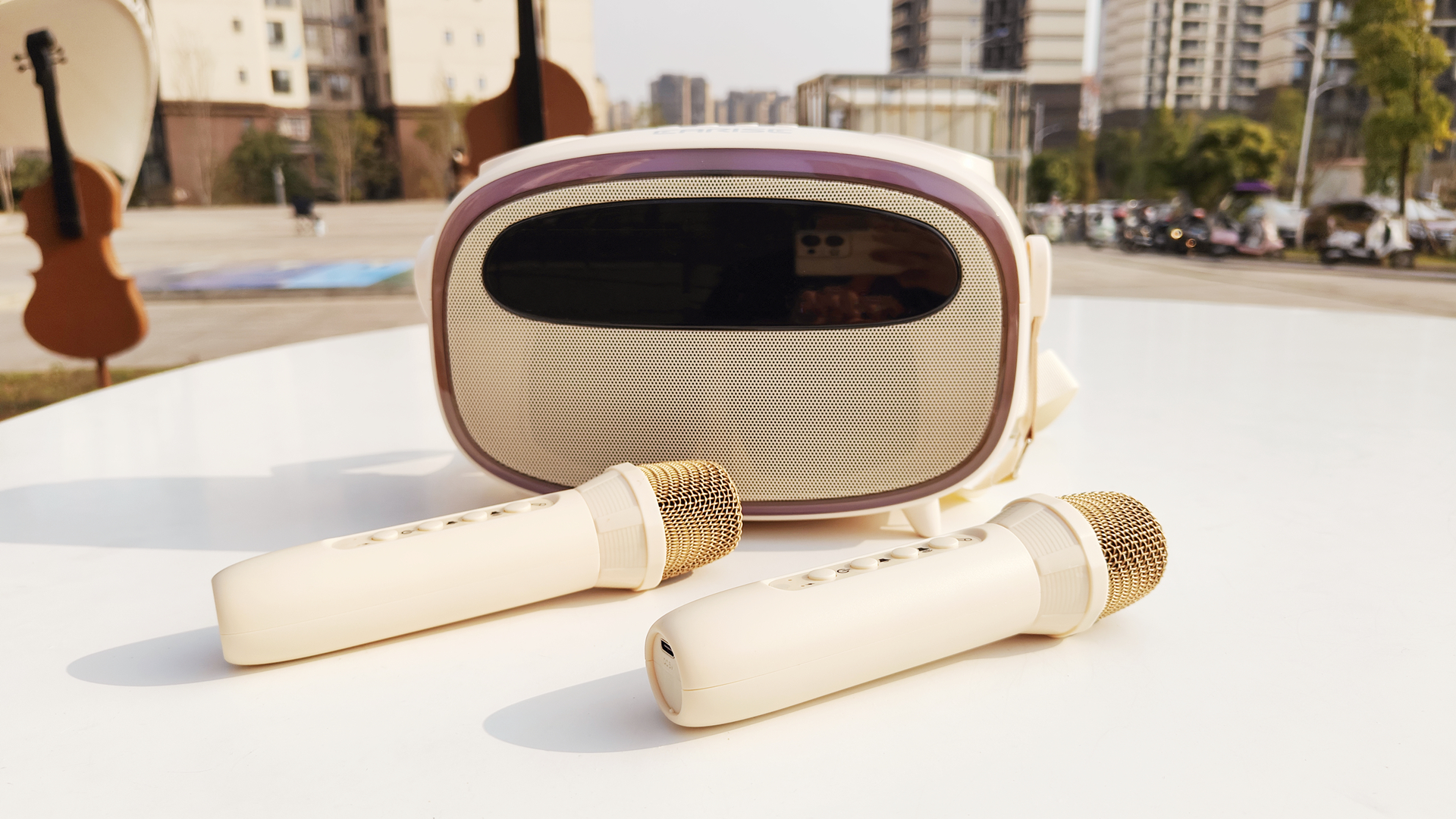 雅兰仕K歌提词音箱配备两个高颜值的无线动圈麦克风,不用时可以直接收纳在音箱顶部。
