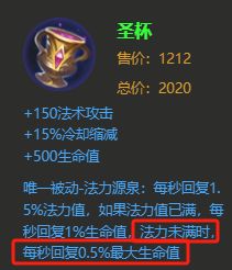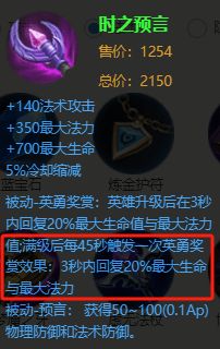 时之预言:新版本的时之预言,对游走桑启来说,无疑是削弱了双抗的加成。但是被动英雄奖赏增加了满级后每45秒触发一次英勇奖赏效果:3秒内回复20%最大生命与最大法力的效果,让他对于桑启来说的性价比又蹭地一下就提高了。可以说,推荐的第二套出装里,这个被动的回复能力就是用来替代圣杯的回复能力的。就是一个回复能力没那么强,但是能够提供额外双抗的出装。和圣杯再同时出的话,恢复能力会更加丧心病狂,但是我个人觉得不是很有必要了。