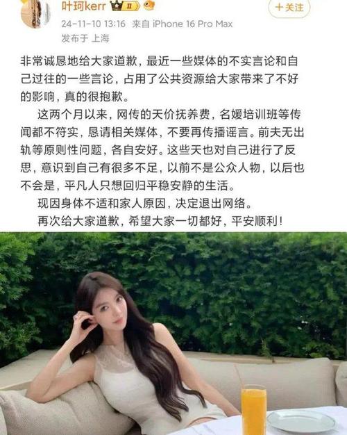 11月10日,叶珂终于忍无可忍,发文道歉并宣布退网。她在声明中提到,自己受到了一些不实信息的困扰,其中就包括那些关于抚养费和名媛培训班的传闻。虽然大家都知道,网络上总是充斥着各种各样的谣言,但这一波操作让人不禁想问:难道网友们的想象力真的有那么丰富?