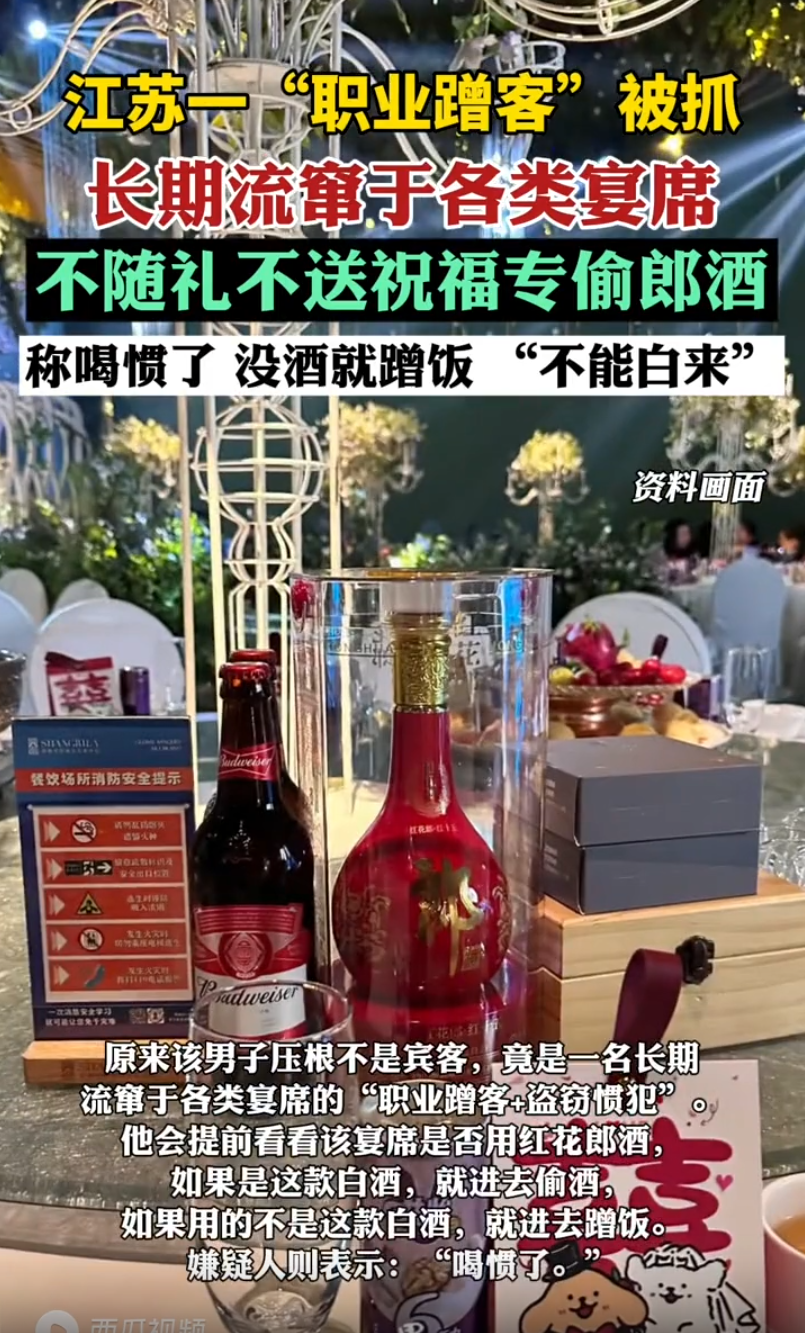 江苏徐州一男子长期流窜于各类宴席 不随礼专偷“郎酒”