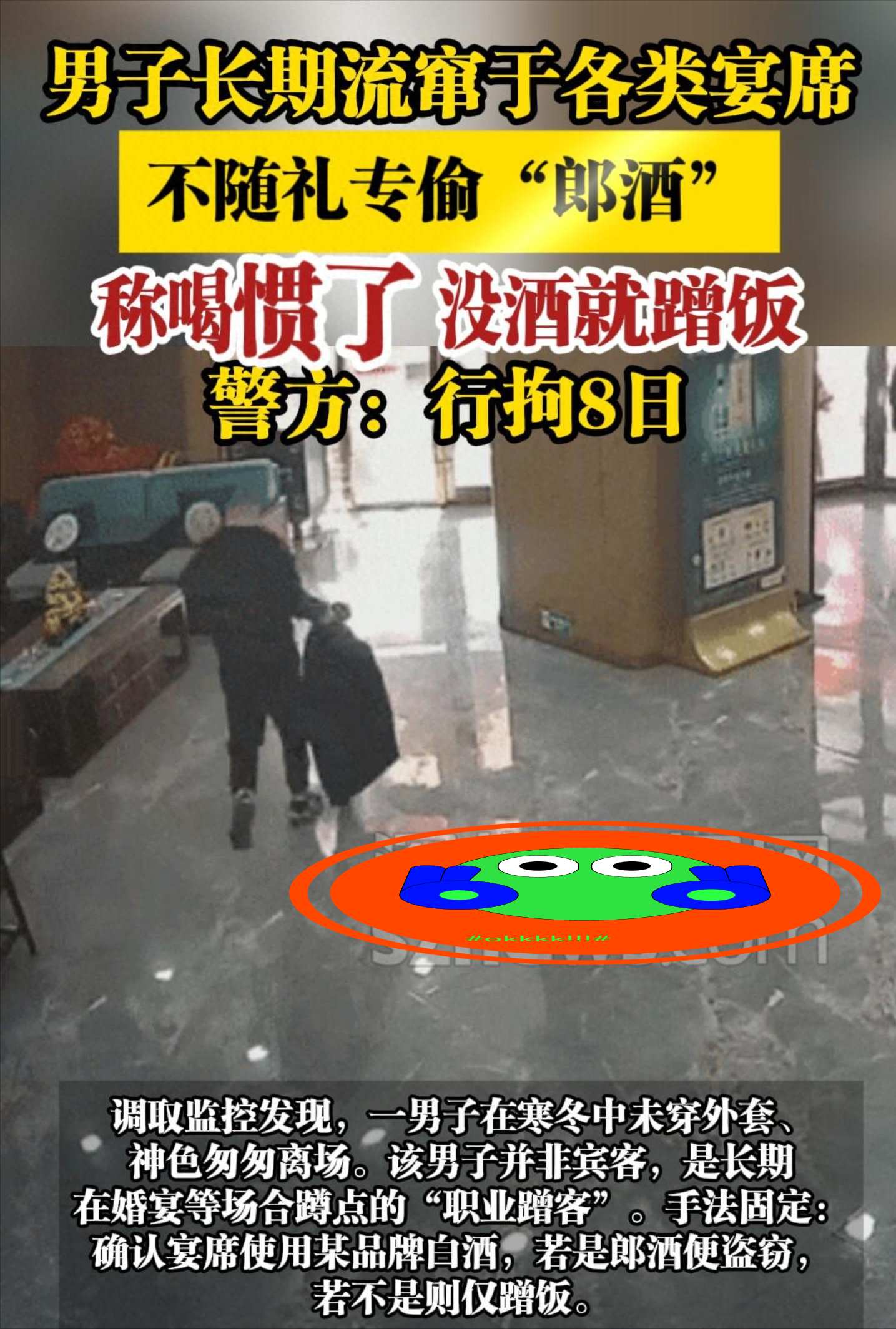 是一名专门在婚宴等场合蹲点的“宴席刺客”,该男子长期流窜于各类宴席场合,只要确认主人家宴席使用的是某品牌白酒,如果是郎酒便顺手牵“酒”,如果不是则要留下来蹭一顿饭。