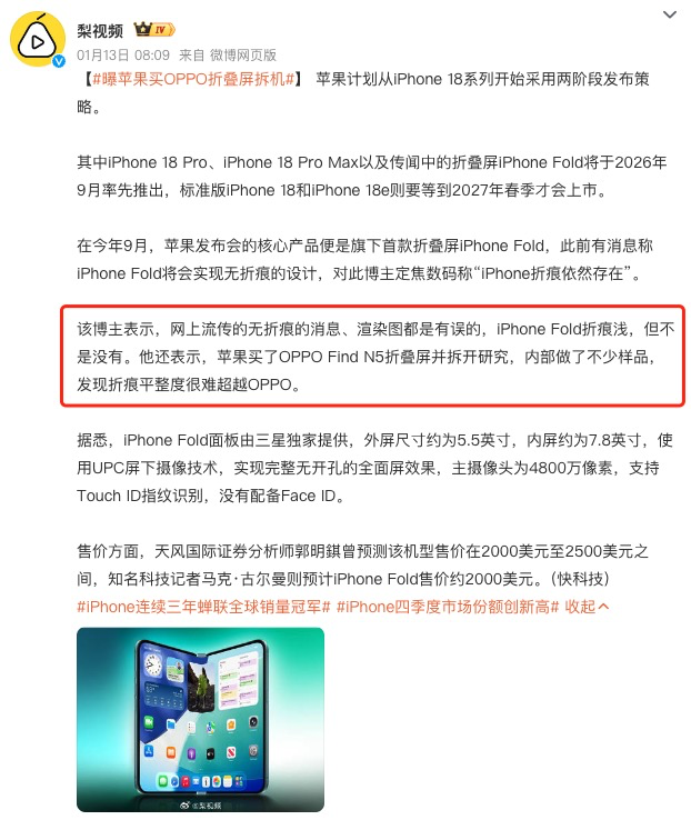 这透露出一个关键信息:目前所谓的“无折痕 iPhone Fold”更多还是停留在传言阶段。我们如果期待“无折痕折叠屏”,倒不如关注一下近期爆料信息也不少的OPPO Find N6。