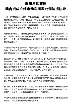 11月7日比亚迪与丰田合资了!双方各出资50%!新合资公司将于2020年正式成立!新公司将在纯电动汽车等相关业务上进行合作。