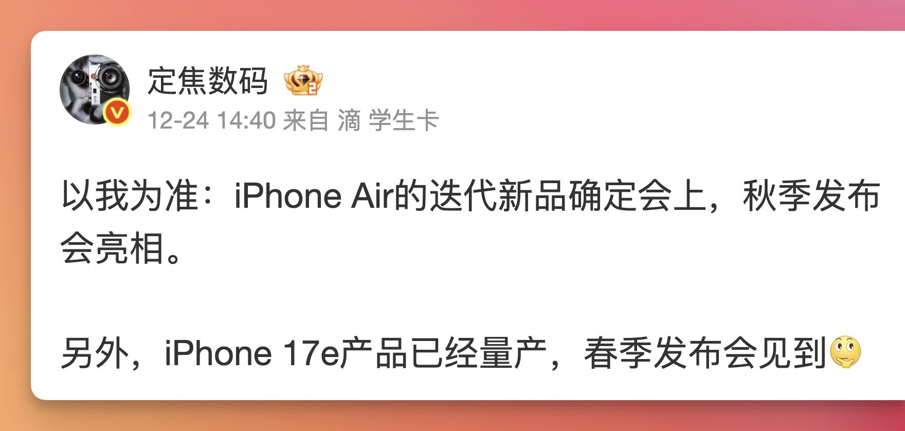 但最近微博用户定焦数码的一则爆料,则给出了一个肯定的判断:苹果依然计划在明年秋季推出 iPhone Air 第二代。该博主还提到,iPhone 17e 已经进入量产阶段,会在明年春季与大家见面。