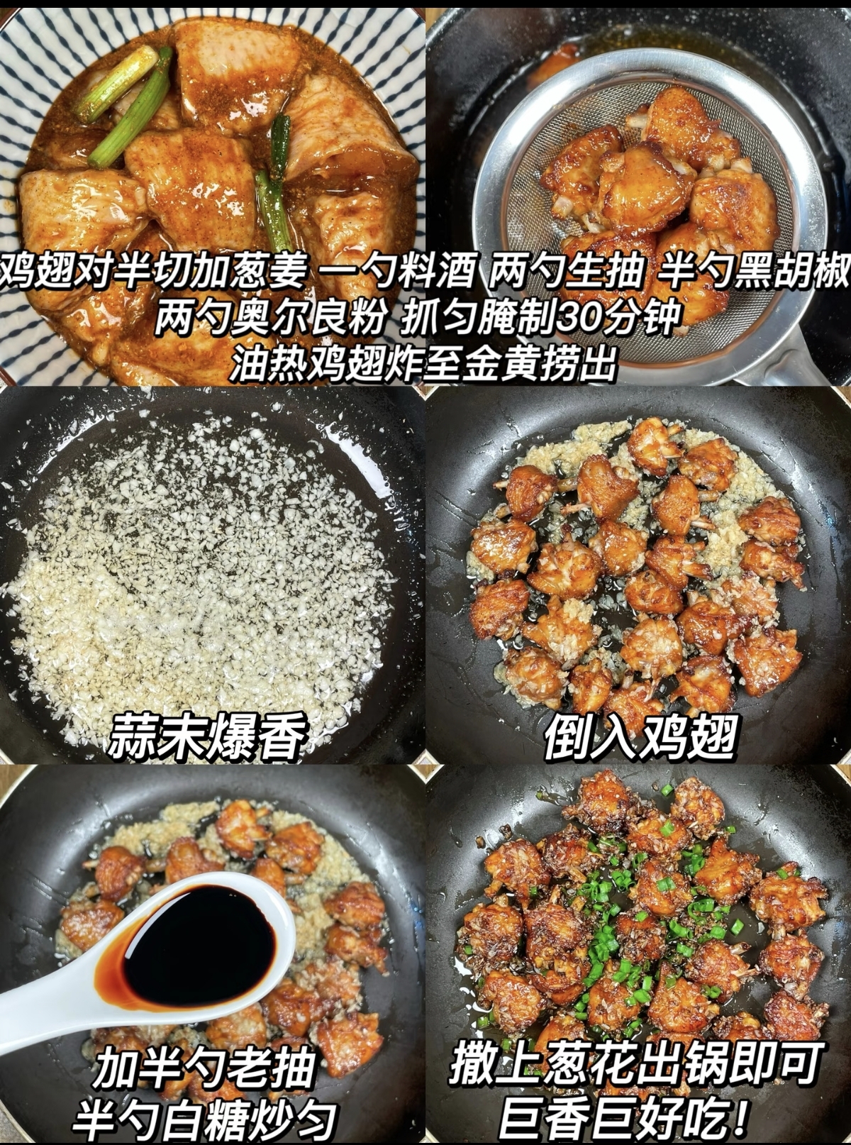 其实,这道菜的做法并不复杂,关键在于腌制与火候的拿捏。首先,准备新鲜鸡中翅12个,用刀在两面划上两刀,方便入味。接着,加入两勺生抽、一勺老抽、一勺料酒、少许白糖和黑胡椒粉,再倒入切好的蒜末——这一步很重要,蒜要多,才能香!我通常会用整整一头大蒜,切成细末,一部分腌制,一部分留着最后爆香。抓拌均匀后,盖上保鲜膜,放入冰箱腌制至少30分钟,时间充裕的话腌一个小时更佳,让酱汁和蒜香彻底渗入鸡肉纤维。