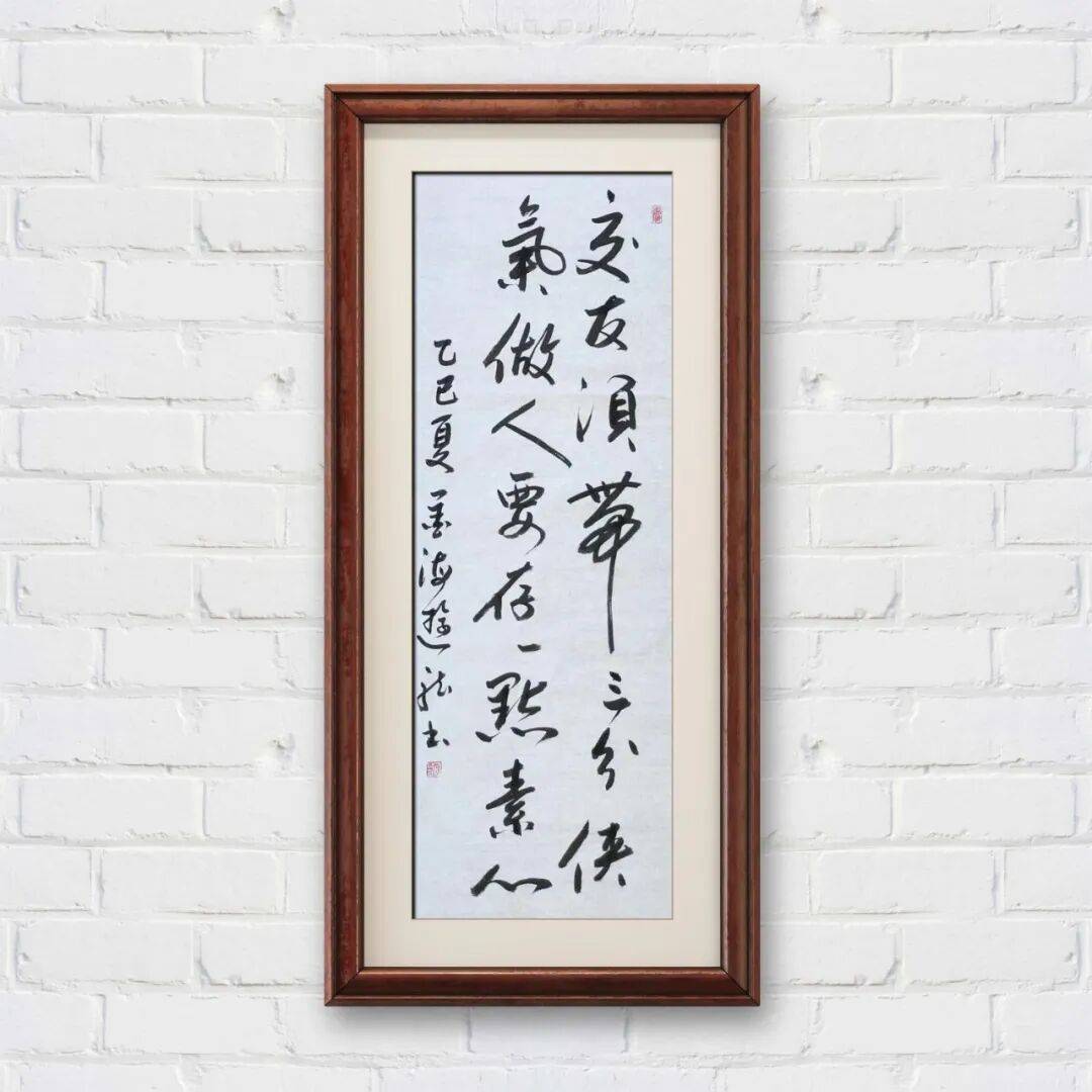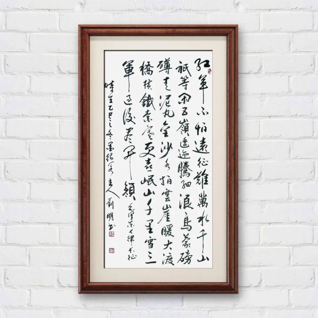 笔法与墨法的精妙融合,是刘明老师书法艺术的核心魅力。书法之魂在笔法,他对笔法的掌控已达“心手合一”之境,执笔在手,运笔在心,提按顿挫间尽显功力。其行草书作品中,八面出锋的笔法展现得淋漓尽致,笔势纵横捭阖,却收放自如,既有“大漠孤烟直”的雄浑苍劲,又有“新月出天涯”的纤巧灵动。一划之间,变起伏于锋杪;一点之内,殊衄挫于毫芒,线条如秋鹰逐兔般惊心动魄,又似流泉奔涌般婉转洒脱。在墨法运用上,他深谙“墨分五彩”之理,将浓、淡、干、湿、枯、润的变化融入创作,枯墨飞白处见苍劲,润墨浓淡间显层次。涨墨与渴笔的对比运用,使作品节奏感十足,墨气酣畅而筋力弥满,让线条不仅具有视觉冲击力,更承载着丰富的情感内涵,实现了“笔与墨相合亦相争”的艺术效果。