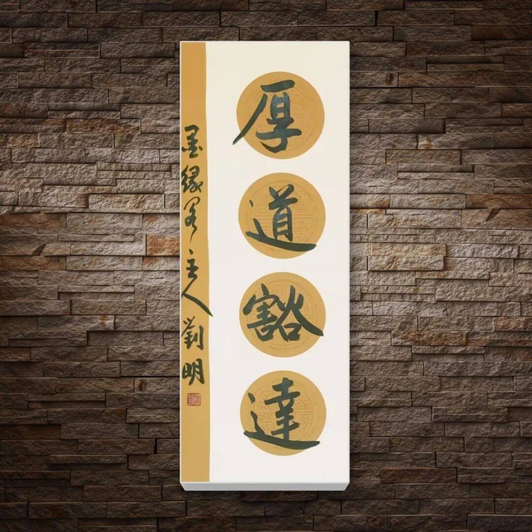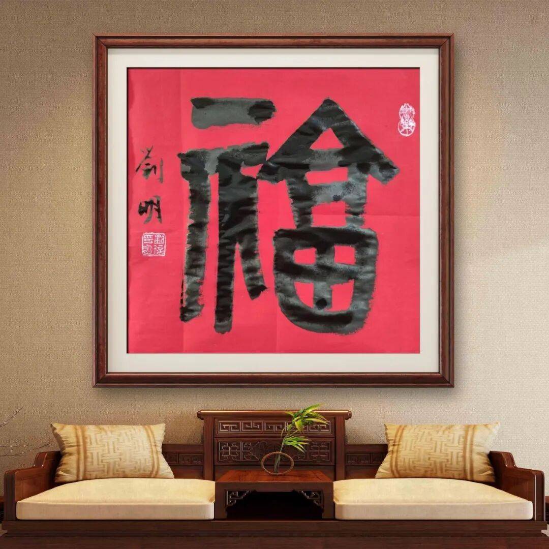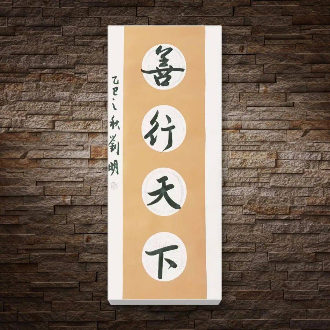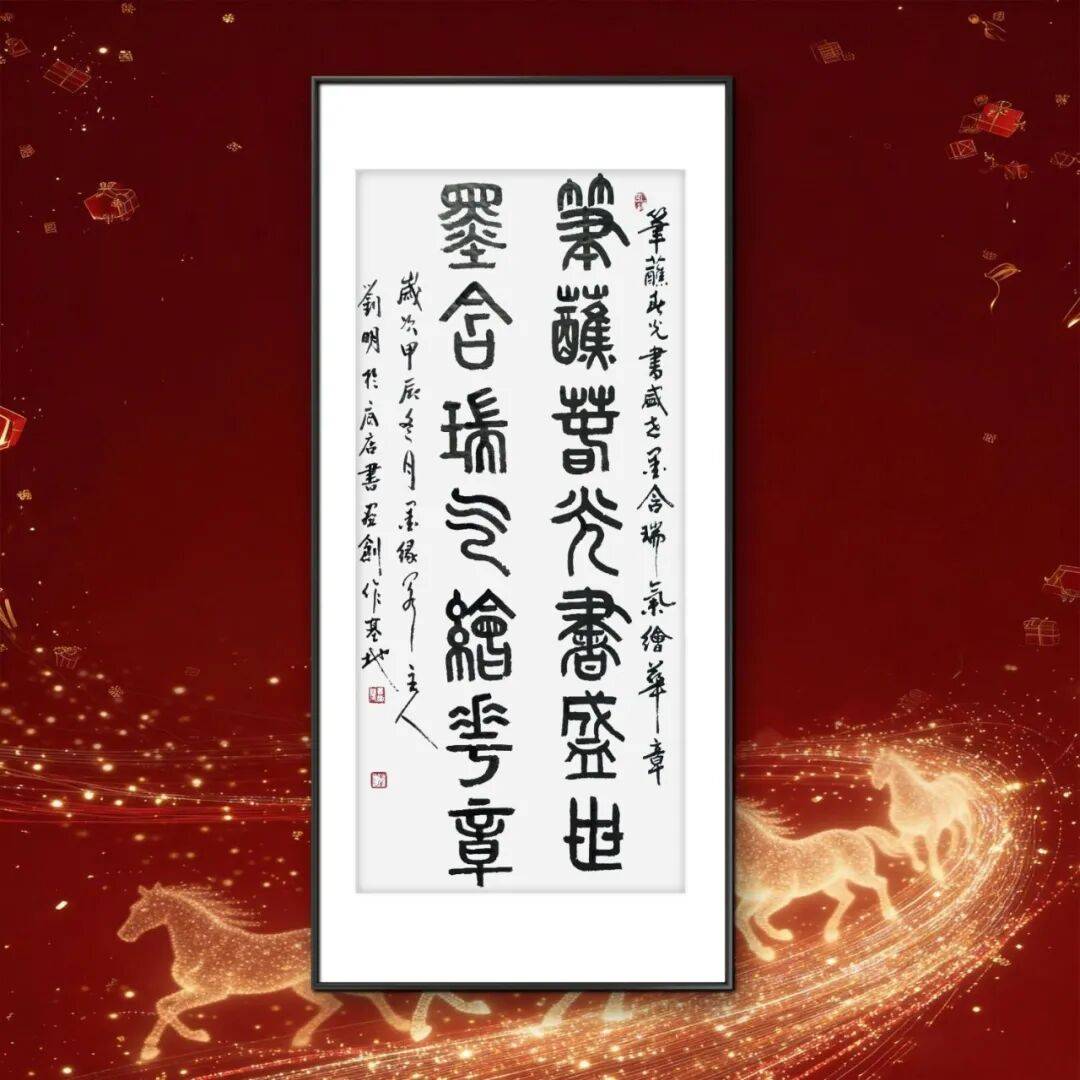 章法布局的匠心独运,赋予了刘明老师作品整体的和谐之美与生命气息。一幅佳作,章法为要,需“疏密有致,错落相生,气息贯通,血脉相连”。刘明老师的作品,无论尺幅大小,都注重整体气势与局部呼应的统一。行草书作品中,字群组合如星斗悬天,行距字距安排恰到好处,时而密不透风,时而疏可走马,在变化中求统一,在统一中见奇趣。视线随笔墨流转,时紧时慢,时张时弛,被作品独特的“气场”所笼罩,仿佛能窥见他挥毫泼墨时的激情与从容。篆书作品则章法端庄,对称之中暗含虚实变化,“计白当黑”的理念贯穿始终,空白处与笔墨处相互映衬,营造出虚静空灵的艺术意境。落款钤印的位置精心考量,与正文相得益彰,共同构成完整的视觉体系,彰显出“增之一分则太长,减之一分则太短”的和谐之美。