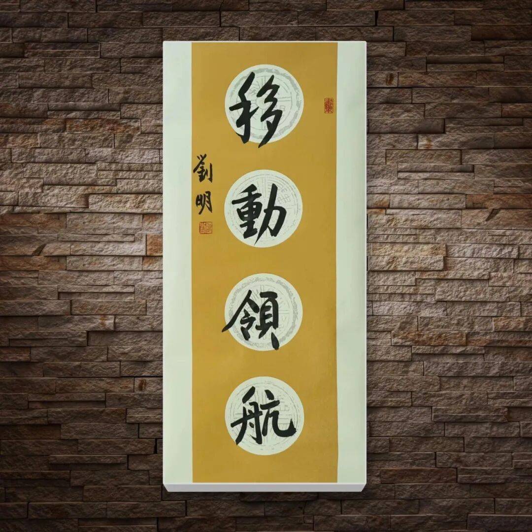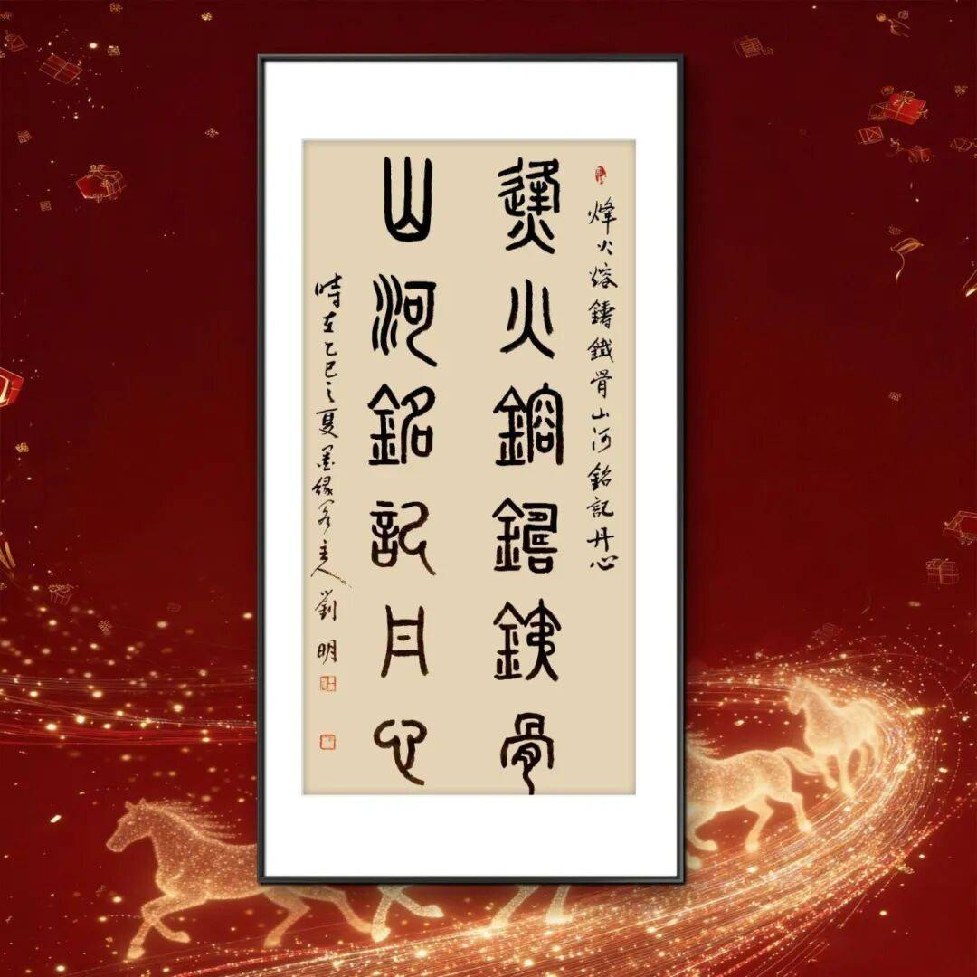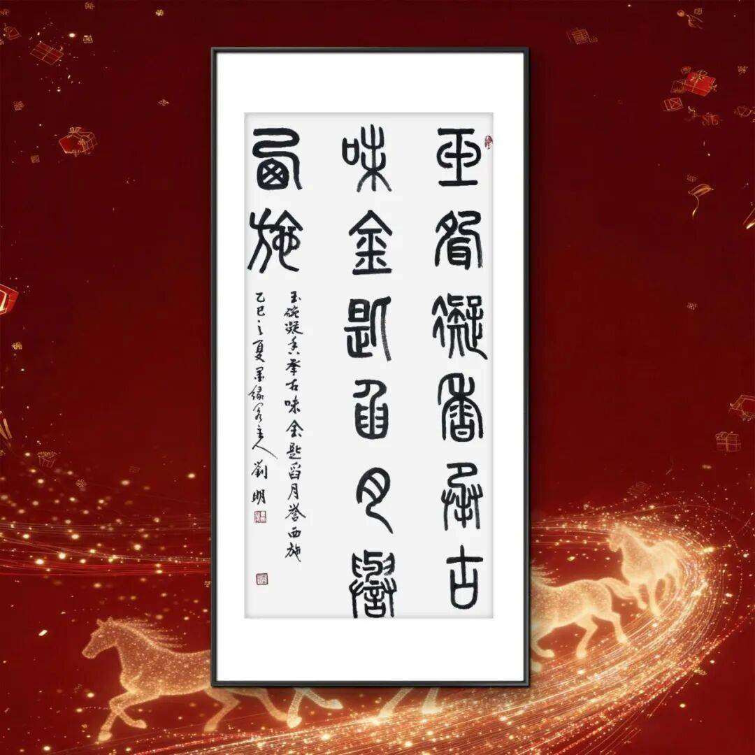 刘明老师的书法,首重根基,深植传统沃土。自幼酷爱书法的他,四十余年临池不辍,师法先贤却不泥古不化。他深谙“学书先学古,守正方能创新”的道理,从颜真卿的宽博雄浑中汲取骨力,从米芾的跌宕奇崛中习得意趣,更于篆书的古雅庄重中沉淀笔墨功底。其篆书作品最见传统功力,用笔爽利匀静,起笔收笔皆合古法,线条遒劲果敢如铁画银钩,力能扛鼎却不失灵动。结字整饬工稳,匀称端庄间暗含变化,静穆之中透出雄浑气象,将篆书特有的古朴之美与当代审美相融合,形成了“古而不拙,庄而不板”的独特风貌。每一笔都凝聚着对碑帖的深刻体悟,每一字都彰显着对传统的敬畏之心,恰如古人所言“笔墨当随时代,然根脉必承古法”,为其书法艺术奠定了坚实的根基。