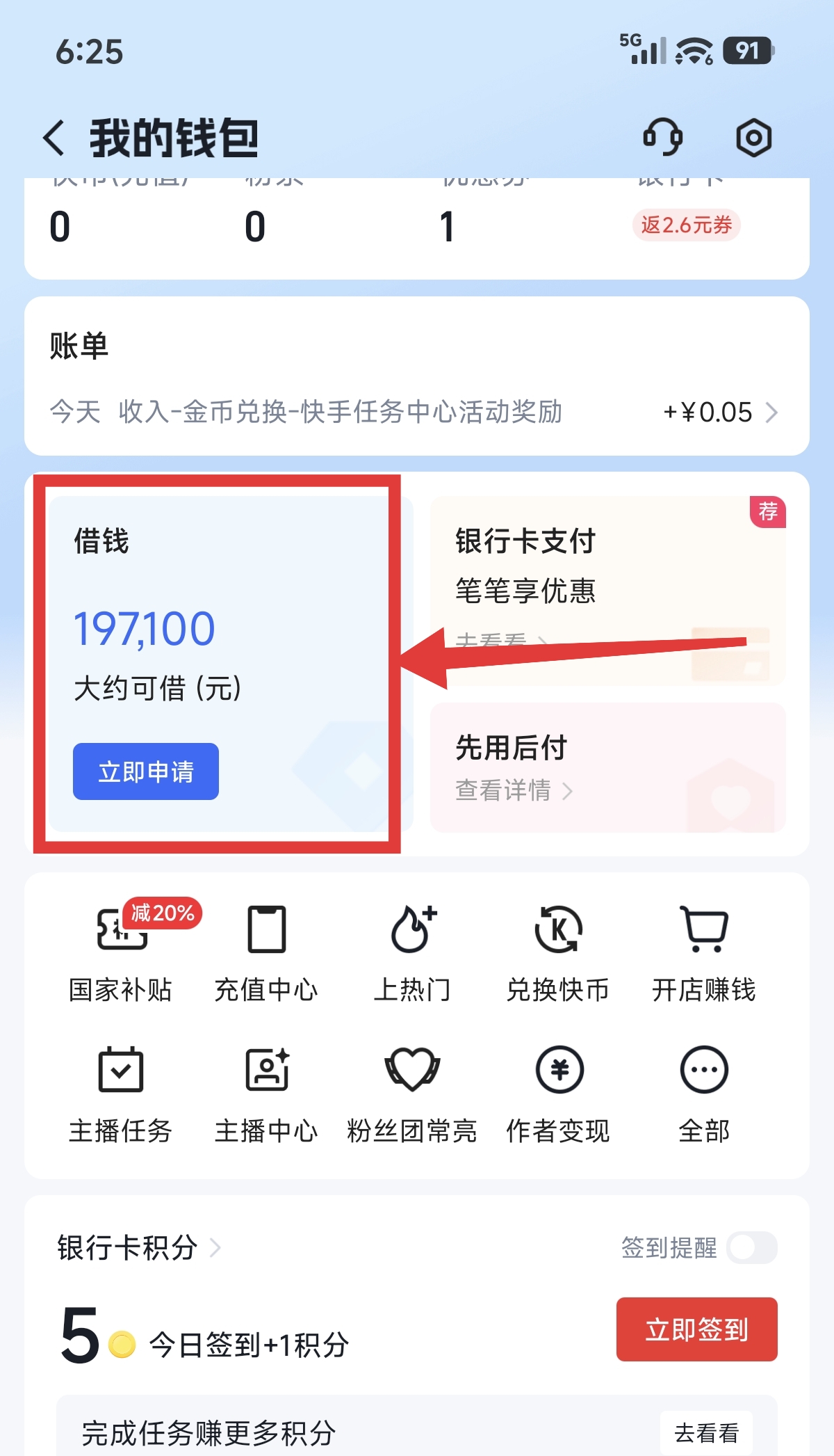 3.进入到我的钱包页面后,点击(借钱立即申请)。