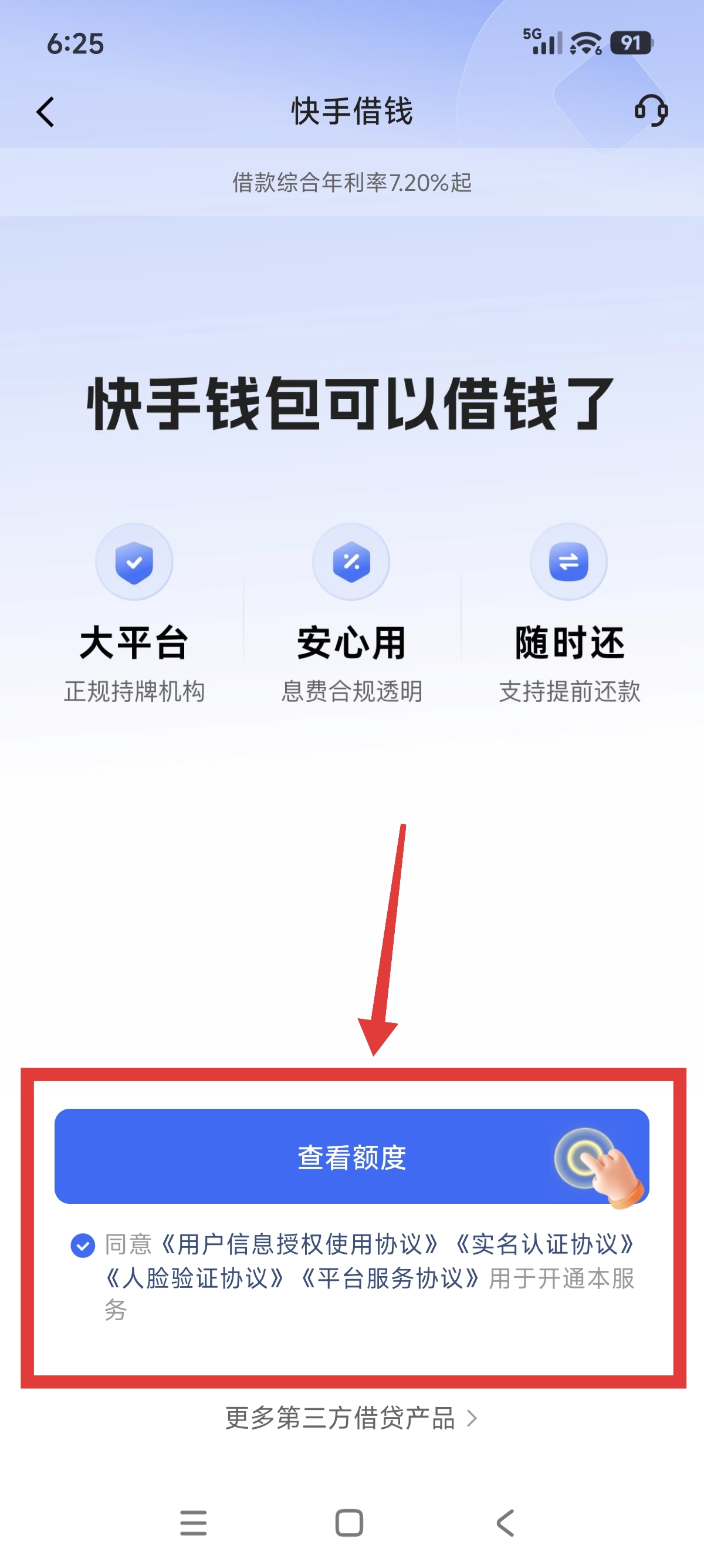 4.进到快手借钱页面后,勾选(同意),然后点击(查看额度)按钮即可借钱了。