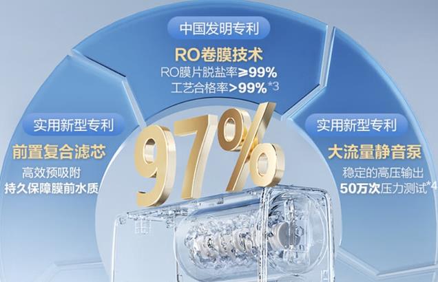 在纯水过滤上,采用97%高脱盐帕斯卡RO膜,比陶氏膜的脱盐率更高,而且5年长效,同时搭载0陈水技术。