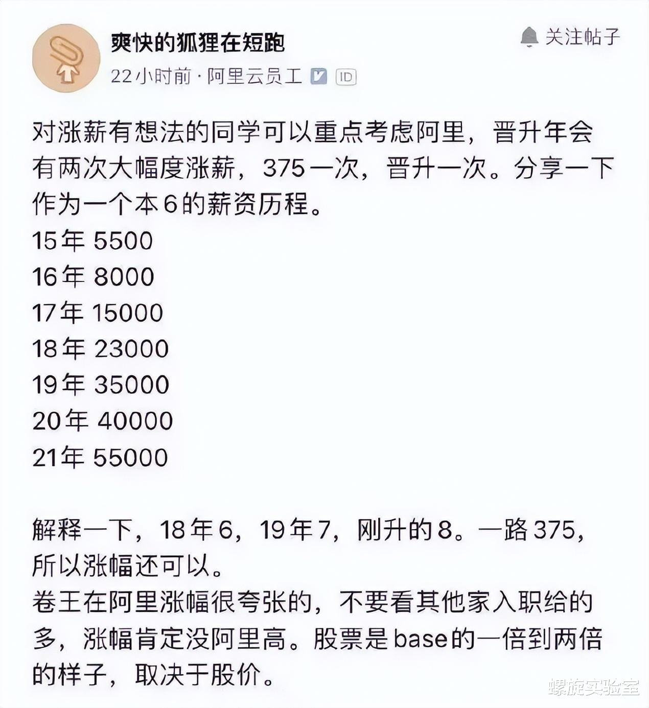 曾有自称阿里云员工的网友,列出了自己从2015年-2021年的薪资历程,仅6年时间,这名阿里员工的薪资便涨了近9倍。