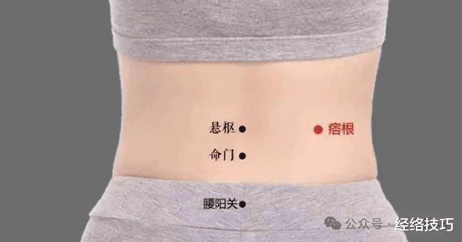 这个穴位是痞根穴,传统的观念认为,腰痛通常和血液循环不畅有关系,要是循环受阻,就会形成硬块,痞根穴里的痞指的是积聚堵塞,根就是根源,这个部位是腰部血液循环容易积累不畅的部位。