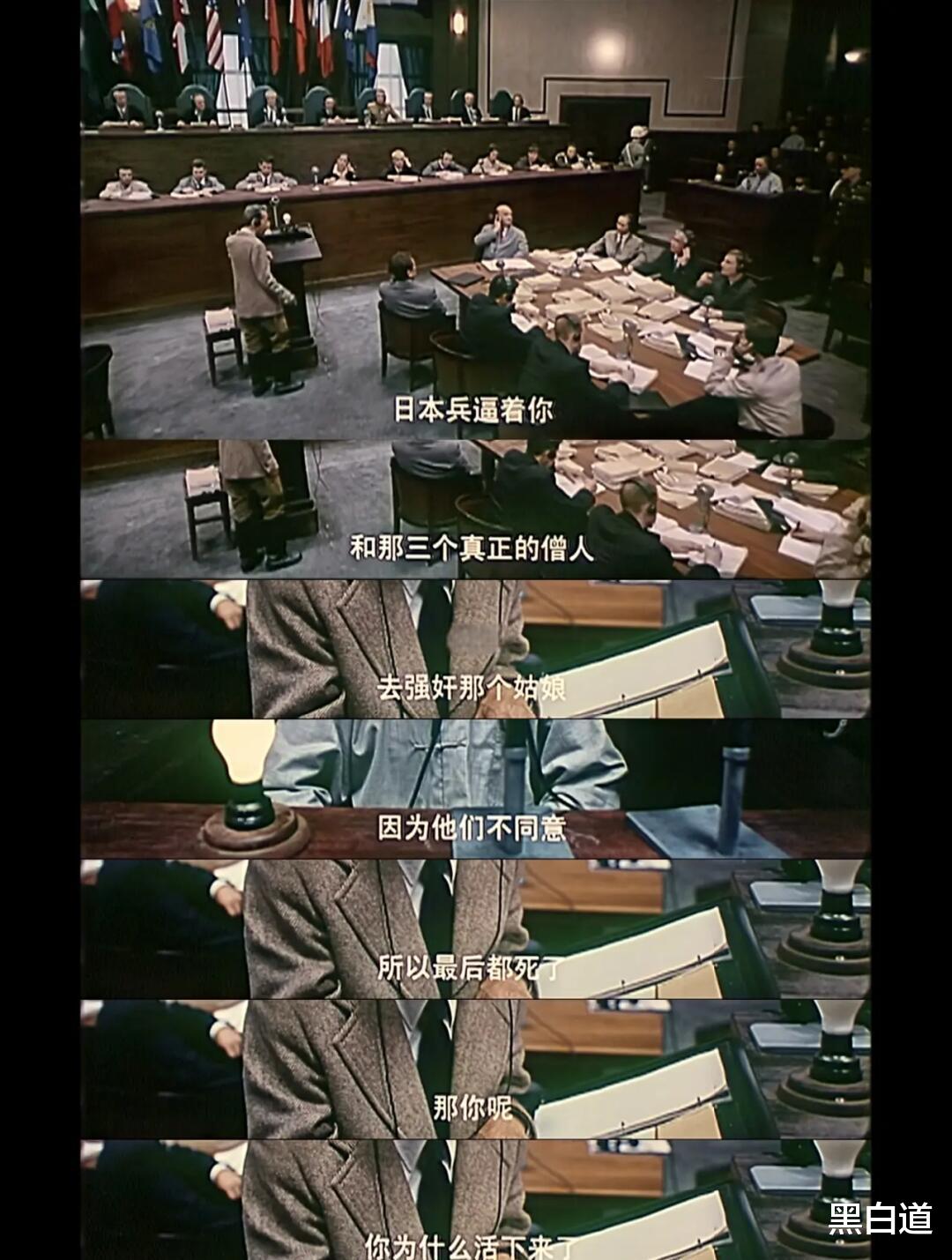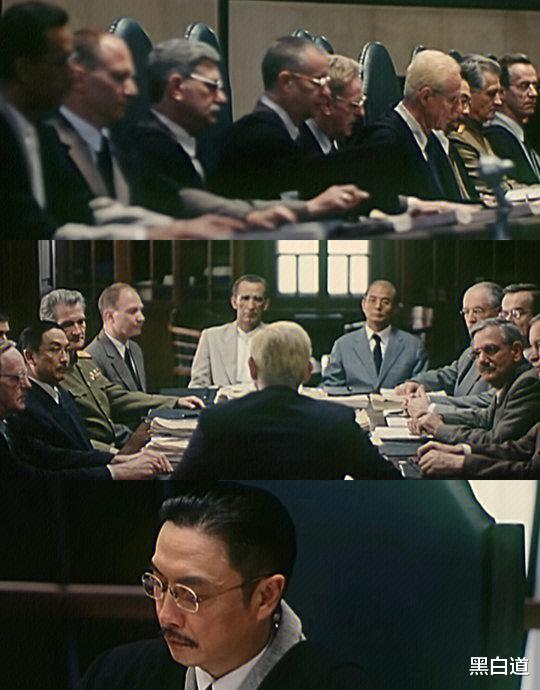 接下来法庭辩论,日本以东条英机为首的战犯一致否认事实,在法庭上叫嚣“无罪”。梅汝璈法官直接拿出了南京大屠杀的证据,将所有证人的自我介绍放在一起,有中国人、欧洲人、有日本人,把他们的证词放在了一起,直指日本军队,当庭质问东条英机:“你们杀了30万中国人,居然还敢说无罪?”东条英机哑口无言。美中不足的是,将审判731部队和天皇的部分一笔带过,可能导演有顾虑吧。