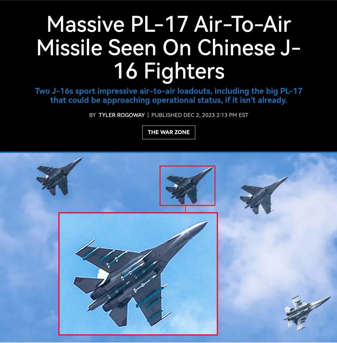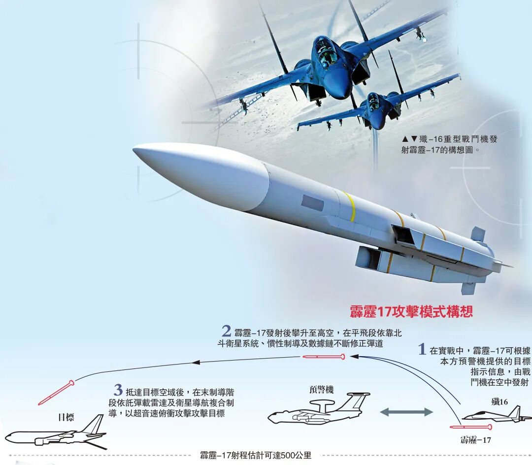 霹雳-17 超远程空空导弹是中国自主研发的超远程空空导弹,2016年首次被媒体曝光挂载在歼-16上测试,2022年10月官媒报道已进入空军服役。弹长超过5米,最大射程400-700公里,速度6马赫,采用无翼式气动布局和三脉冲发动机,专用于打击敌方预警机、加油机、电子战飞机等高价值目标。