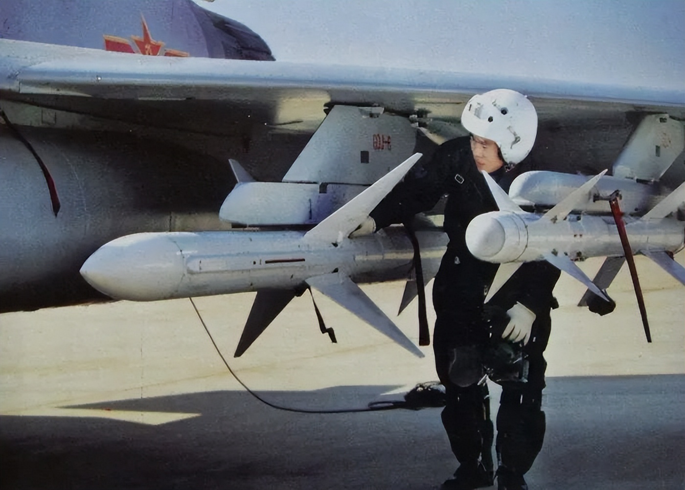 霹雳-1中国首款空空导弹,以苏联K-5M导弹为原型仿制,1958年启动研制,1964年4月投入批量生产并装备歼-6战斗机,于1974年停产退役。该弹采用雷达波束制导,最大射程4.5公里,作战性能有限,仅能尾追攻击轰炸机等大型低速目标。为中国航空武器进入导弹时代奠定了基础。