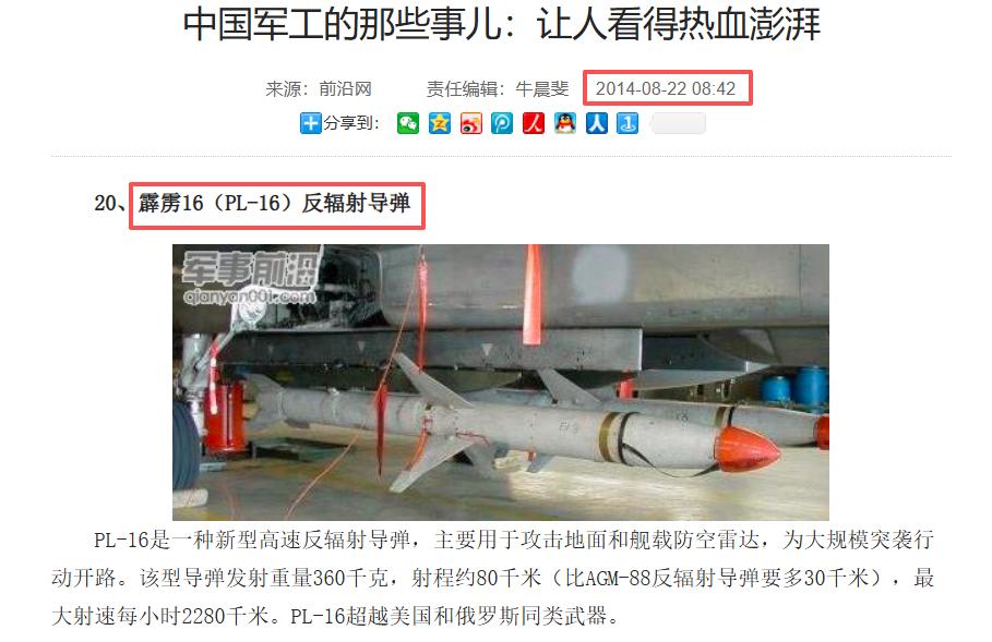 PL-16反辐射弹:在中国军网2014年的一篇报道中查到了相关信息: