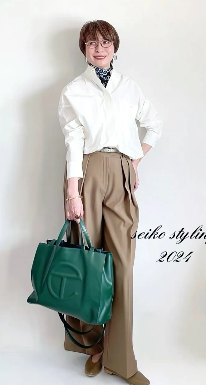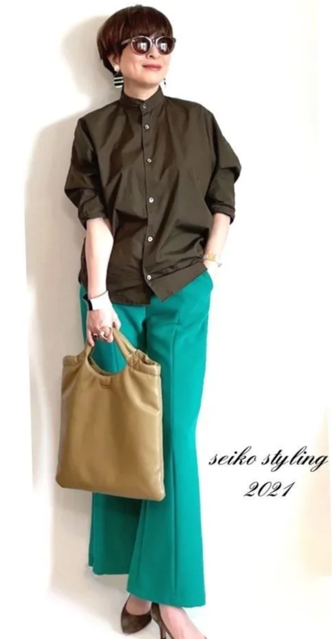 很多女人到了50岁左右的年龄阶段,总是觉得穿衣服应当低调些,所以挑选的服装色彩就十分沉闷老气。实际上,中年女人更应该选择多穿亮色,例如鹅黄色阔腿裤搭配藏蓝色透肤衬衫,就特别时尚吸睛。
