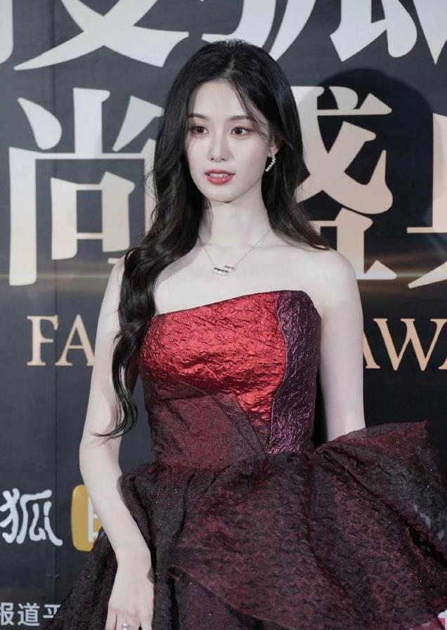 这一晚,她身穿渐变色酒红晚礼服出场,晚礼服似乎还使用了特殊材质,看起来像是染色的铝箔纸。