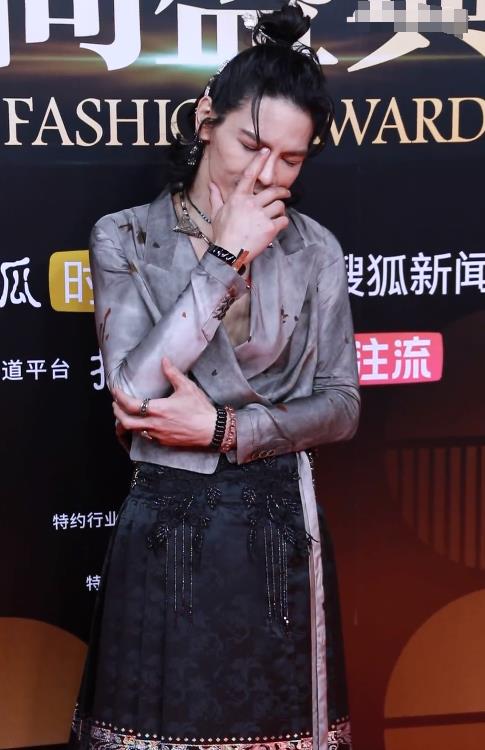 这哥穿着马面裙,戴着媳妇儿郭碧婷亲手制作的项链,画着浓妆,戴着耳环登场。