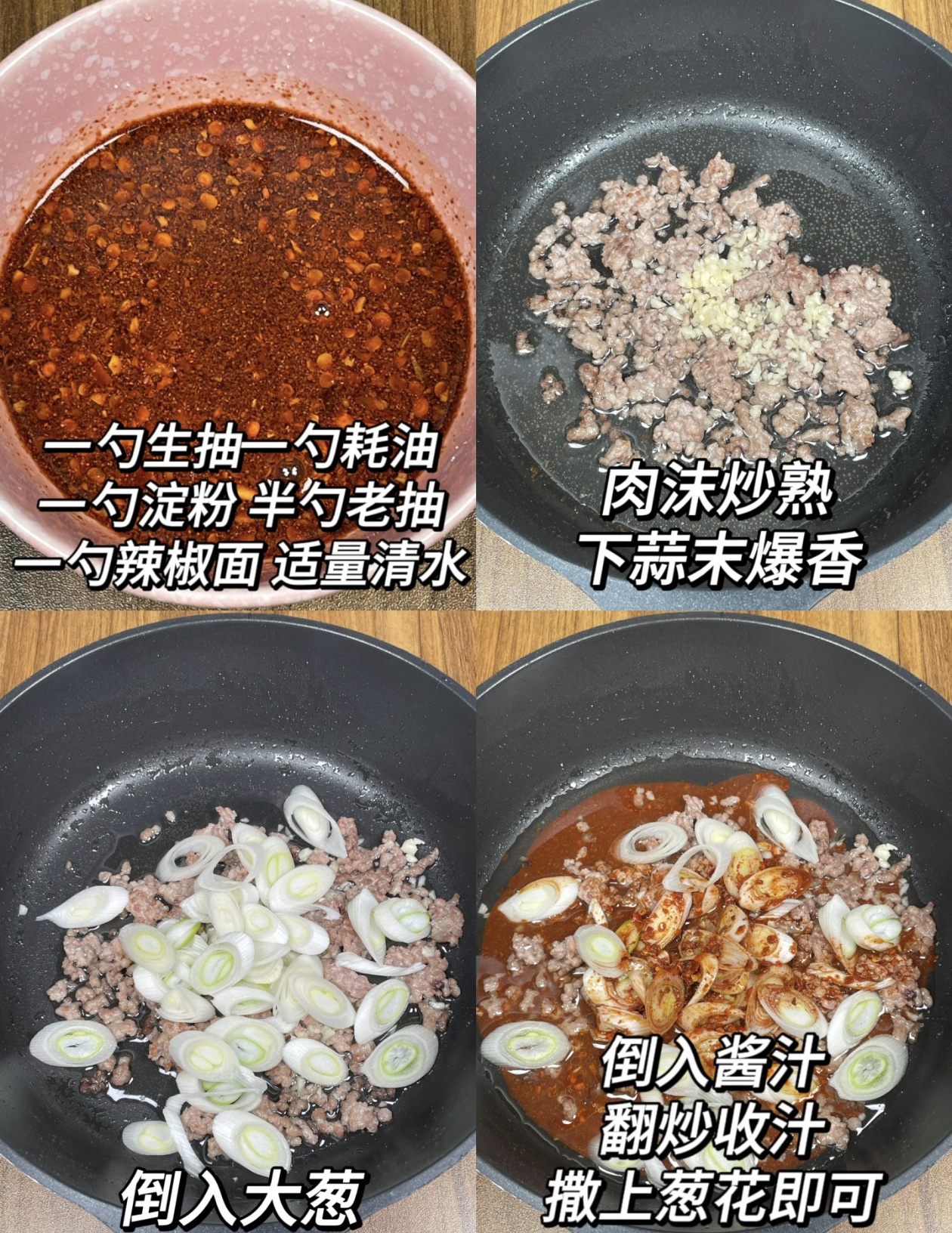 接下来是调酱汁,这是整道菜的灵魂所在。在一个小碗里,依次加入一勺生抽、一勺蚝油、半勺老抽、一勺淀粉、一勺辣椒面,再倒入适量清水,用筷子充分搅拌均匀,直到没有干粉颗粒。生抽负责提鲜,蚝油增加醇厚的口感,老抽给菜品染上诱人的红亮色泽,淀粉则能让酱汁变得浓稠,牢牢裹在每一粒肉沫和葱片上,而辣椒面则根据个人口味添加,不吃辣的朋友可以完全省略。