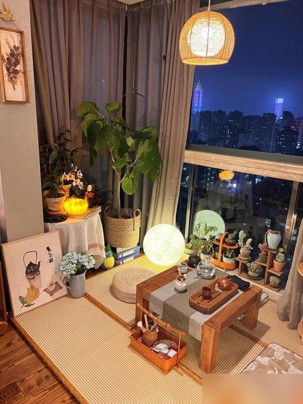灯光就用暖串灯十块一条绕栏杆两圈插头往屋里一拖星星点点闪得跟村口KTV似的拍照可能俗肉眼看着却真治愈;想看书再加USB小夹灯鹅颈随便拗光线集中不扰邻居省得物业敲门。