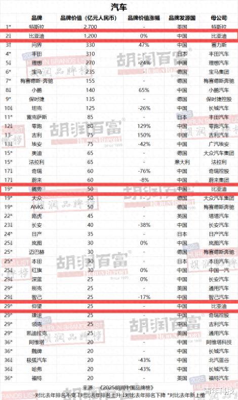 2025 胡润汽车品牌榜新鲜出炉!比亚迪又拿第一,这已经是连续四年稳坐中国汽车品牌头把交椅,品牌价值 1200 亿。
