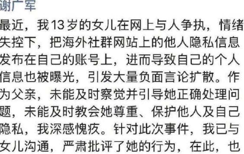 在父亲谢广军为事件道歉后,事情并未平息,她对于自己国籍的言论更是引发了公众的强烈不满。