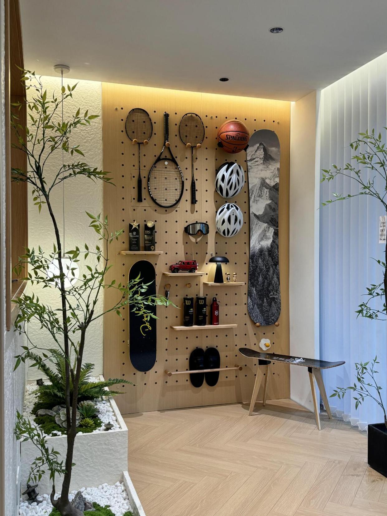其实,可以在家中一面空白的墙面装块洞洞板,这样篮球、羽毛球拍等运动器材就可以收纳在这了。洞洞板可以挂公路自行车、滑板和滑雪装备。