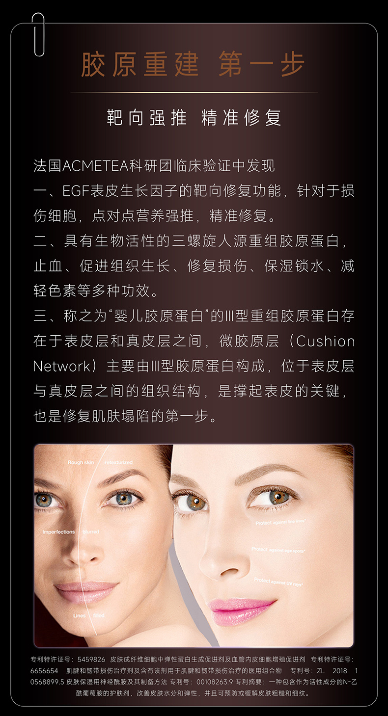 1、正版ACME-TEA(细胞能量蛋白)术后专 用营能激活胶原纤维、弹性纤维和透明质酸的活体生成,除了皮肤美白专利:专利号ZL201810603225.4和皮肤保湿专利:专利号ZL201810568899.5,还有专门针对于 拉皮手 术过程当中俢复损伤细胞同时为新细胞提供生长能量的三项专利:
