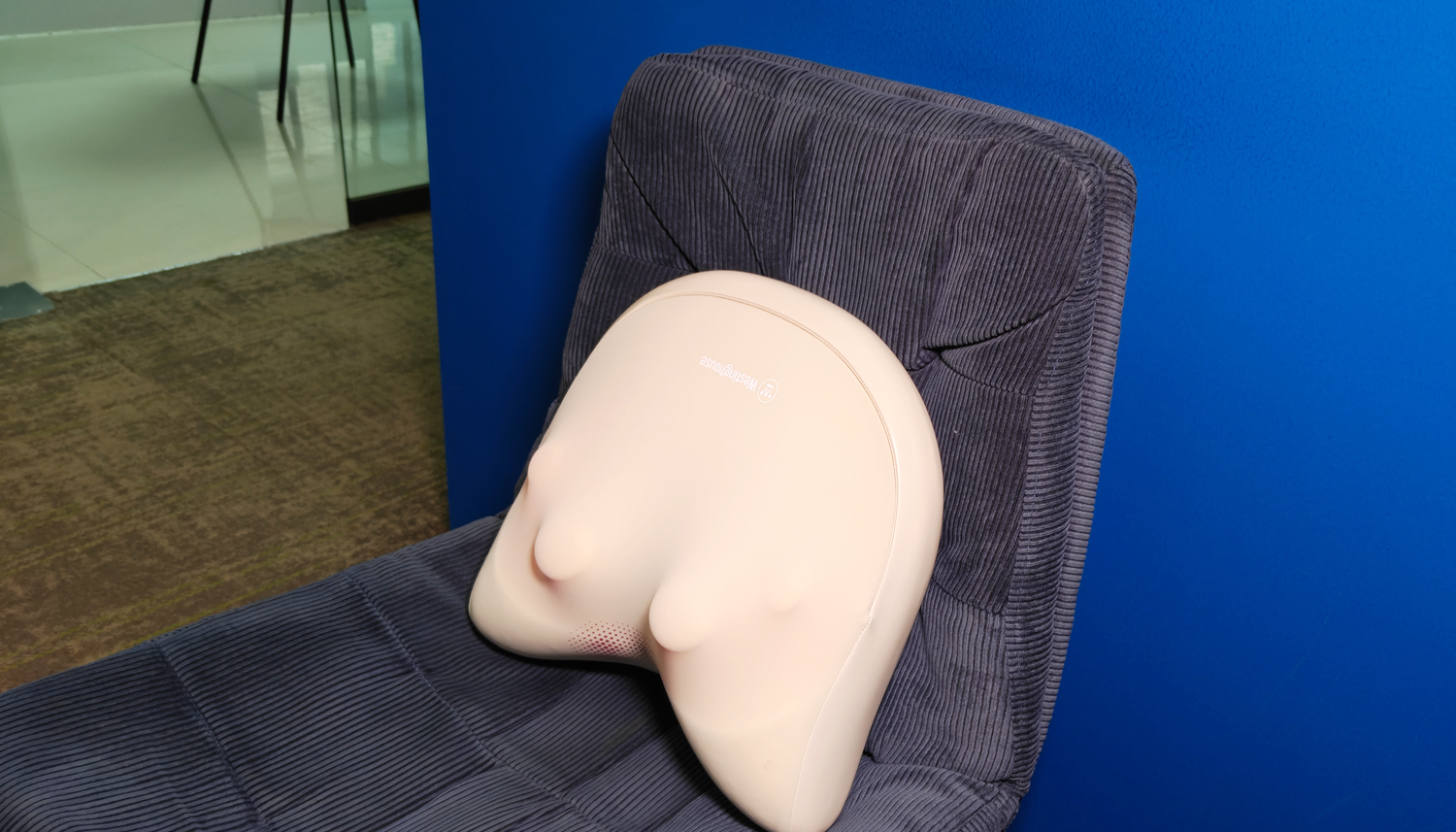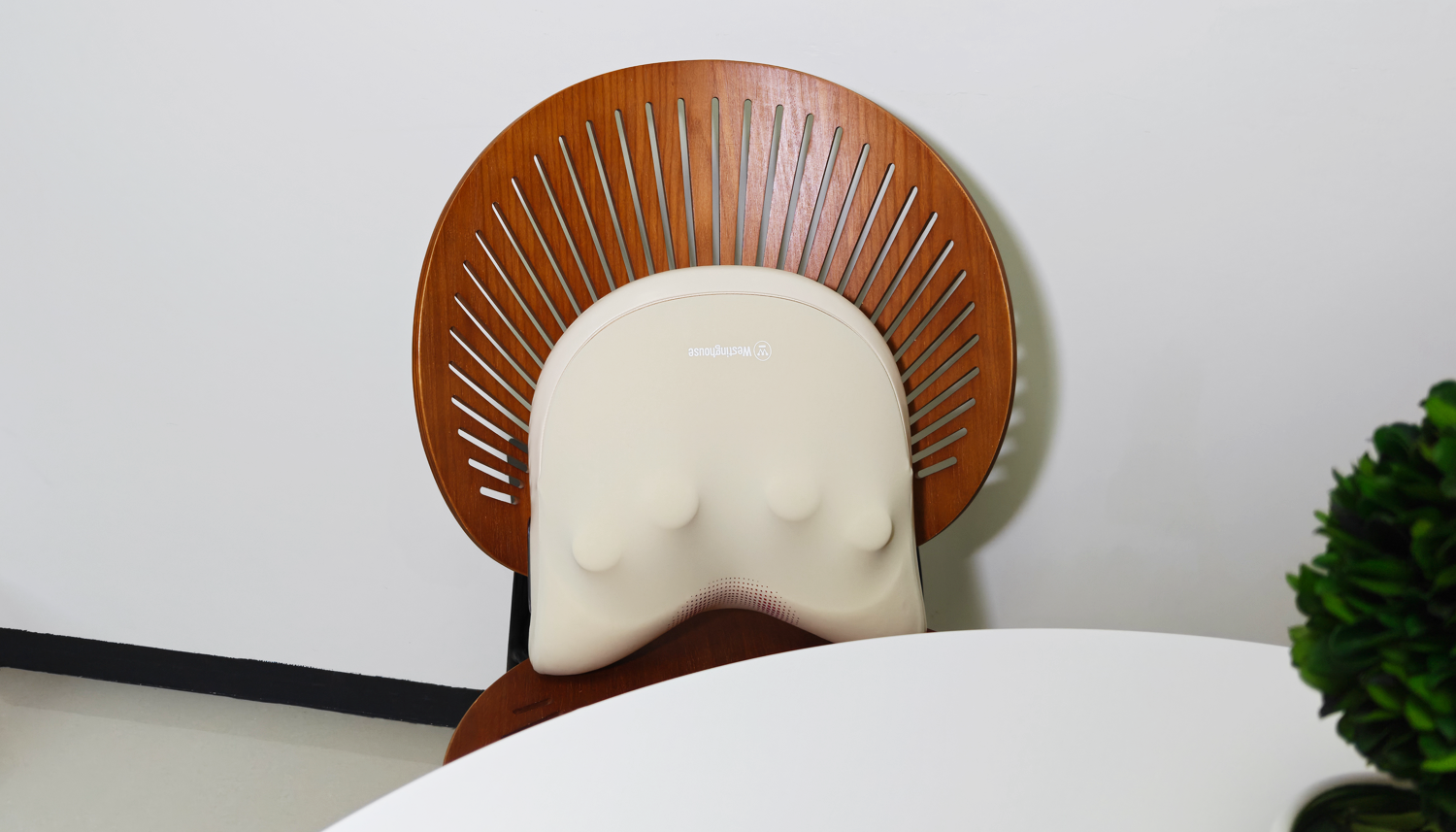 我的首要需求是缓解久坐引起的腰酸背痛,因此只需将西屋BX3PLUS按摩仪直立到椅子上就行。摆放时注意让带大开角的一面朝下,这样按摩头能更好地贴合腰部肌肉曲线。