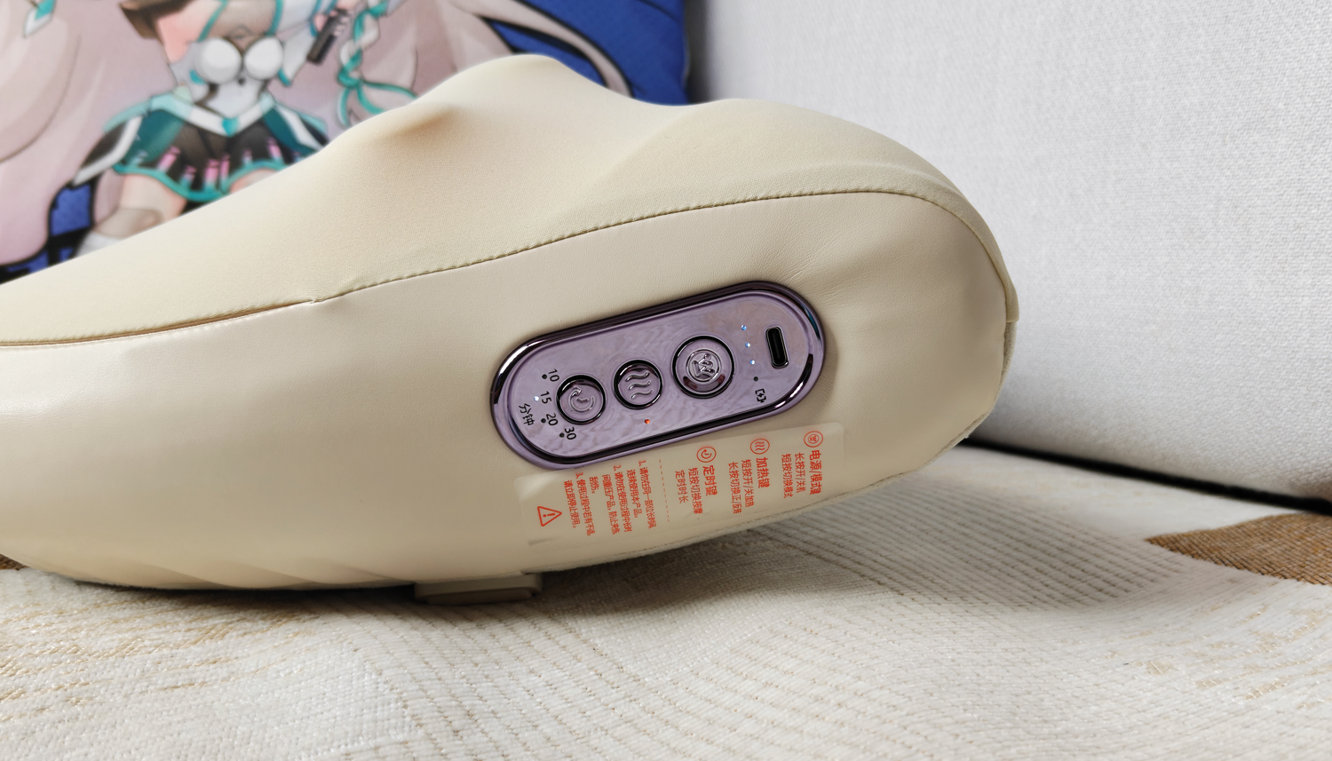 操控区域都集中在侧面,包含开关/挡位切换键、热敷键、定时键、电量指示灯以及Type-C充电接口。三颗物理按键都做得比较大,闭着眼睛摸也能分得清,调节各项功能都很方便。
