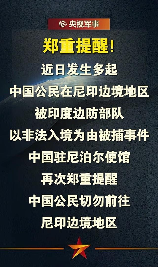 在5月31日,央视新闻报道称:近日发生多起中国公民在尼印边境地区被印度边防部队以非法入境为由被捕事件,中国驻尼泊尔使馆再次郑重提醒中国公民切勿前往尼印边境地区。显然这就是印度当局,印度军方,在边境,包括?尼印边境地区找事了,印度军队在印巴战斗中,打输,被歼-10CE+霹雳-15E空空导弹+红旗-9防空导弹+CM-400空对地导弹的打击,丢了脸借题发挥。所以,中国公民确实前往边境,包括尼印边境地区要小心了,印度军队。印度当局开始准备迁怒我们了。