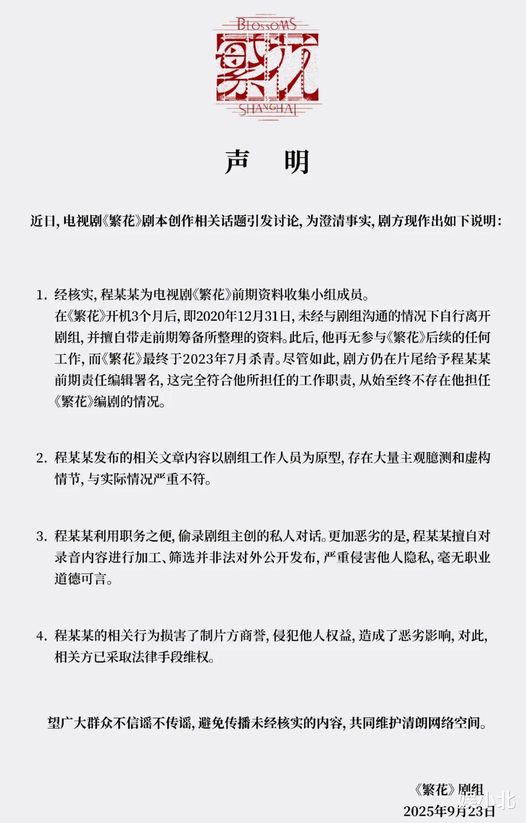 同时,还被《繁花》剧组以“严重侵害他人隐私,毫无职业道德可言”警告。