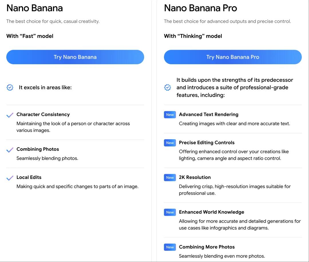 使用 Nano banana (Gemini 2.5 Flash Image) 获取更快、更低成本的图像生成/编辑;使用 Nano banana Pro(Gemini 3 Pro Image)处理更加复杂、要求更高的任务,但成本与延迟也更高。