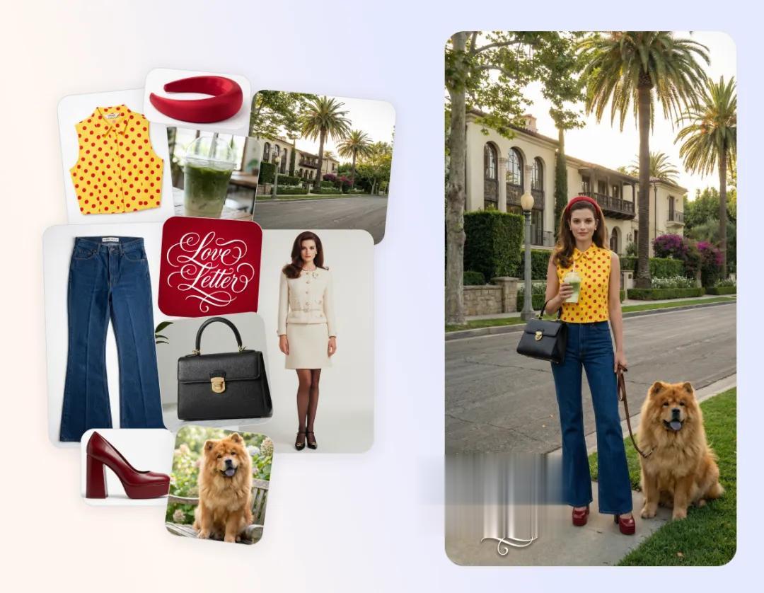 举个大家最熟悉的例子:只需上传一张简单的服装图和人物照片,再配上一两句限制性文本指令,它就能快速精准地将元素融合,轻松生成风格统一、构图自然,并且保持人物和服装一致的 OOTD 合成照。感兴趣的读者可以看看我们这一篇报道,轻轻松松做一名时尚博主。