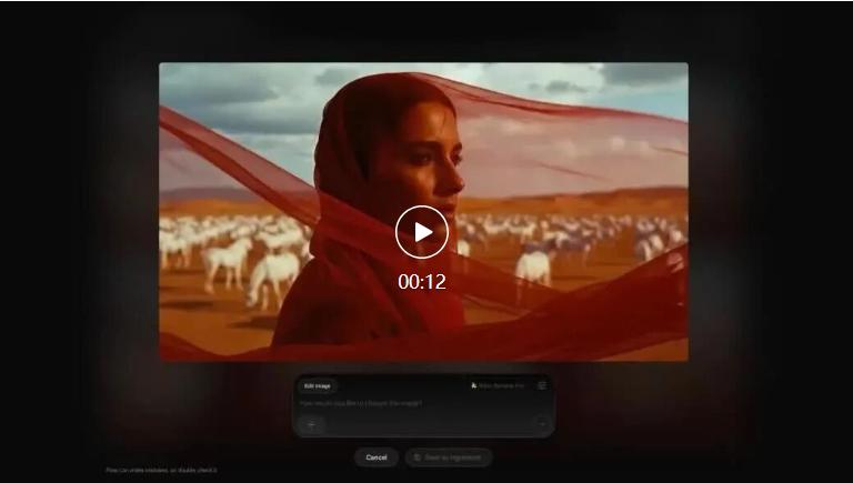 视频中也简单演示了从一张图像,到天气的重塑,最后使用 Veo 3 模型生成极具电影风格的视频的全过程。下面两个示例不仅能够展示 Nano Banana Pro 强大的创意控制能力,也展开了结合首尾帧视频生成的全新可能。